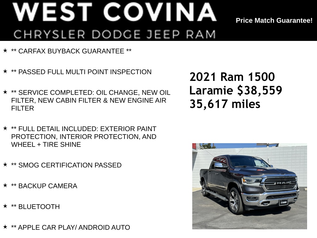 MEMORIAL DAY SALES EVENT HAS STARTED!!! COME CHECK OUT OUR HARD TO BEAT INVENTORY PRICES THAT HAVE BEEN REDUCED TO SAVE YOU MONEY. CALL (626) 899-9302 TO GET MORE INFORMATIONWE SPECIALIZE IN ALL CREDIT PROFILES! See what we can do for you! Call to find out (626) 899-9302.CARFAX One-Owner. Clean CARFAX.Odometer is 12985 miles below market average! ** CARFAX BUYBACK GUARANTEE **, ** PASSED FULL MULTI POINT INSPECTION, ** SERVICE COMPLETED: OIL CHANGE, NEW OIL FILTER, NEW CABIN FILTER & NEW ENGINE AIR FILTER, ** FULL DETAIL INCLUDED: EXTERIOR PAINT PROTECTION, INTERIOR PROTECTION, AND WHEEL + TIRE SHINE, ** SMOG CERTIFICATION PASSED, ** BACKUP CAMERA, ** BLUETOOTH, ** APPLE CAR PLAY/ ANDROID AUTO, 1-Yr SiriusXM Guardian Trial, 4G LTE Wi-Fi Hot Spot, 5-Year SiriusXM Traffic Service, 5-Year SiriusXM Travel Link Service, 8.4" Touchscreen Display, Apple CarPlay, Auto High Beam Headlamp Control, Bed Utility Group, Disassociated Touchscreen Display, Foam Bottle Insert (Door Trim Panel), For Details, Visit DriveUconnect.com, For More Info, Call 800-643-2112, Google Android Auto, GPS Antenna Input, GPS Navigation, harman/kardon 19 Speaker Premium Sound, HD Radio, Heated Second Row Seats, Integrated Center Stack Radio, Integrated Voice Command w/Bluetooth, Laramie Level B Equipment Group, MOPAR 4 Adjustable Cargo Tie-Down Hooks, MOPAR Deployable Bed Step, MOPAR Spray In Bedliner, ParkSense Front/Rear Park Assist w/Stop, Pick-Up Box Lighting, Protection Group, Quick Order Package 27H Laramie, Radio: Uconnect 4C Nav w/8.4" Display, Rain Sensitive Windshield Wipers, Rear 60/40 Folding Split Recline Seat, Rear Underseat Compartment Storage, Remote Tailgate Release, SiriusXM Radio Service, SiriusXM Satellite Radio, SiriusXM Traffic Plus, SiriusXM Travel Link, Tailgate Ajar Warning Lamp, Tow Hooks, USB Host Flip.Granite Crystal Metallic Clearcoat2021 Ram 1500 Laramie 4WD 8-Speed Automatic HEMI 5.7L V8 Multi Displacement VVT**********All Pricing and Advertised Prices for any/all vehicles offered for sale does not include dealer installed accessories which can be purchased for an additional cost.********** The Factory Rebates may not be available on this vehicle if you elect to take advantage of a Special Alternative APR or Special Lease program. Some Factory Rebates are California Resident specific and may vary for residents of other states. NO sales to Dealers, Brokers or Exporters. For out of state purchase, customers must be present to purchase. If shipping is required, dealership must facilitate; no exceptions. Please contact us for special Multi-Vehicle or Fleet pricing. Prices are plus government fees and taxes, any finance charges, $85 documentary fee, $29 electronic registration fee, any emission testing charge and $1.75 per new tire state tire fee. *** We make every effort to provide accurate information, but please verify before purchasing. Leasing & financing available on approved credit. Trade-ins accepted. Subject to prior sale.Awards: * JD Power Automotive Performance, Execution and Layout (APEAL) Study * Motor Trend Automobiles of the year