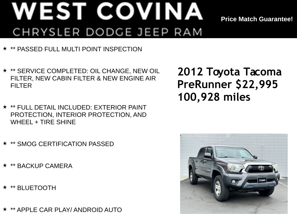 WE SPECIALIZE IN ALL CREDIT PROFILES! See what we can do for you! Call to find out (626) 899-9302.Recent Arrival! CARFAX One-Owner. Clean CARFAX.Odometer is 24389 miles below market average! ** PASSED FULL MULTI POINT INSPECTION, ** SERVICE COMPLETED: OIL CHANGE, NEW OIL FILTER, NEW CABIN FILTER & NEW ENGINE AIR FILTER, ** FULL DETAIL INCLUDED: EXTERIOR PAINT PROTECTION, INTERIOR PROTECTION, AND WHEEL + TIRE SHINE, ** SMOG CERTIFICATION PASSED, ** BACKUP CAMERA, ** BLUETOOTH, ** APPLE CAR PLAY/ ANDROID AUTO.O2012 Toyota Tacoma PreRunner RWD 5-Speed Automatic with Overdrive 4.0L V6 EFI DOHC 24V**********All Pricing and Advertised Prices for any/all vehicles offered for sale does not include dealer installed accessories which can be purchased for an additional cost.********** The Factory Rebates may not be available on this vehicle if you elect to take advantage of a Special Alternative APR or Special Lease program. Some Factory Rebates are California Resident specific and may vary for residents of other states. NO sales to Dealers, Brokers or Exporters. For out of state purchase, customers must be present to purchase. If shipping is required, dealership must facilitate; no exceptions. Please contact us for special Multi-Vehicle or Fleet pricing. Prices are plus government fees and taxes, any finance charges, $85 documentary fee, $29 electronic registration fee, any emission testing charge and $1.75 per new tire state tire fee. *** We make every effort to provide accurate information, but please verify before purchasing. Leasing & financing available on approved credit. Trade-ins accepted. Subject to prior sale.Awards: * 2012 KBB.com Best Resale Value Awards * 2012 KBB.com 10 Best Used Trucks Under $20,000Reviews: * If you’re looking for a proven pickup that is as capable as it is stylish, the 2012 Toyota Tacoma pickup deserves your full attention. Nearly as capable as a full-size pickup, but without the extra bulk or poor fuel economy, the Tacoma offers a wide selection ranging from everyday work truck to rugged off-road adventurer. Source: KBB.com * Engines offer a good balance of power and fuel efficiency; wide variety of body styles and trims; strong safety scores; impressive build quality; well-appointed interior. Source: Edmunds