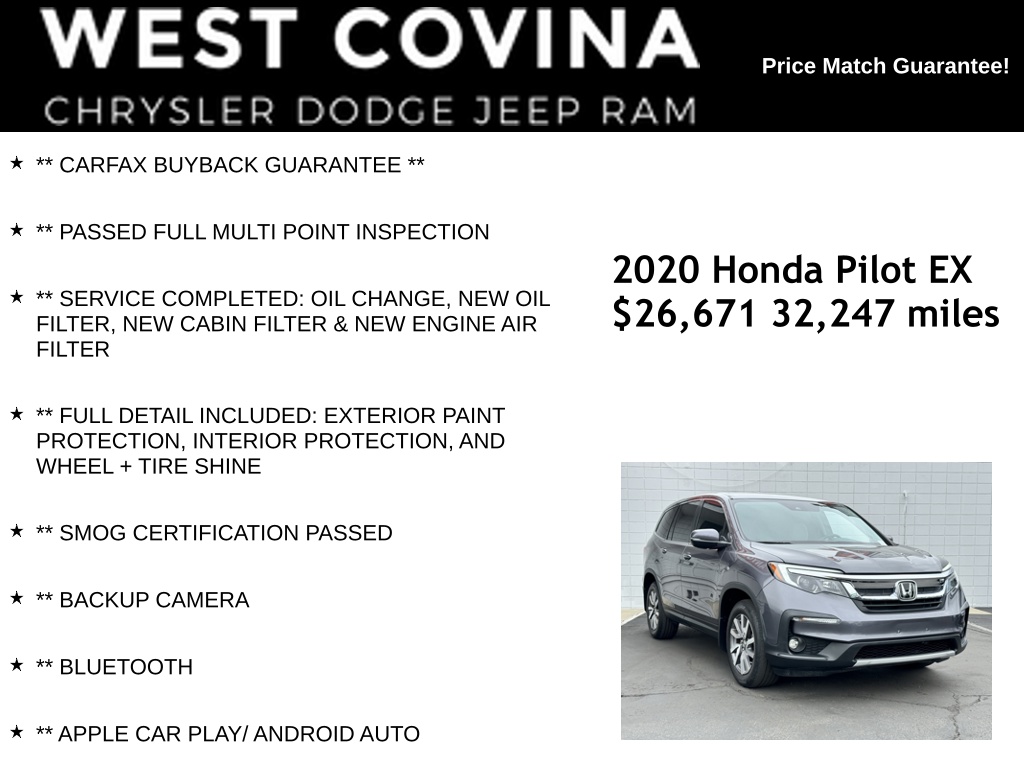WE SPECIALIZE IN ALL CREDIT PROFILES! See what we can do for you! Call to find out (626) 899-9302.Recent Arrival! CARFAX One-Owner.19/27 City/Highway MPG ** CARFAX BUYBACK GUARANTEE **, ** PASSED FULL MULTI POINT INSPECTION, ** SERVICE COMPLETED: OIL CHANGE, NEW OIL FILTER, NEW CABIN FILTER & NEW ENGINE AIR FILTER, ** FULL DETAIL INCLUDED: EXTERIOR PAINT PROTECTION, INTERIOR PROTECTION, AND WHEEL + TIRE SHINE, ** SMOG CERTIFICATION PASSED, ** BACKUP CAMERA, ** BLUETOOTH, ** APPLE CAR PLAY/ ANDROID AUTO.Gray2020 Honda Pilot EX FWD 6-Speed Automatic 3.5L V6 24V SOHC i-VTEC**********All Pricing and Advertised Prices for any/all vehicles offered for sale does not include dealer installed accessories which can be purchased for an additional cost.********** The Factory Rebates may not be available on this vehicle if you elect to take advantage of a Special Alternative APR or Special Lease program. Some Factory Rebates are California Resident specific and may vary for residents of other states. NO sales to Dealers, Brokers or Exporters. For out of state purchase, customers must be present to purchase. If shipping is required, dealership must facilitate; no exceptions. Please contact us for special Multi-Vehicle or Fleet pricing. Prices are plus government fees and taxes, any finance charges, $85 documentary fee, $29 electronic registration fee, any emission testing charge and $1.75 per new tire state tire fee. *** We make every effort to provide accurate information, but please verify before purchasing. Leasing & financing available on approved credit. Trade-ins accepted. Subject to prior sale.