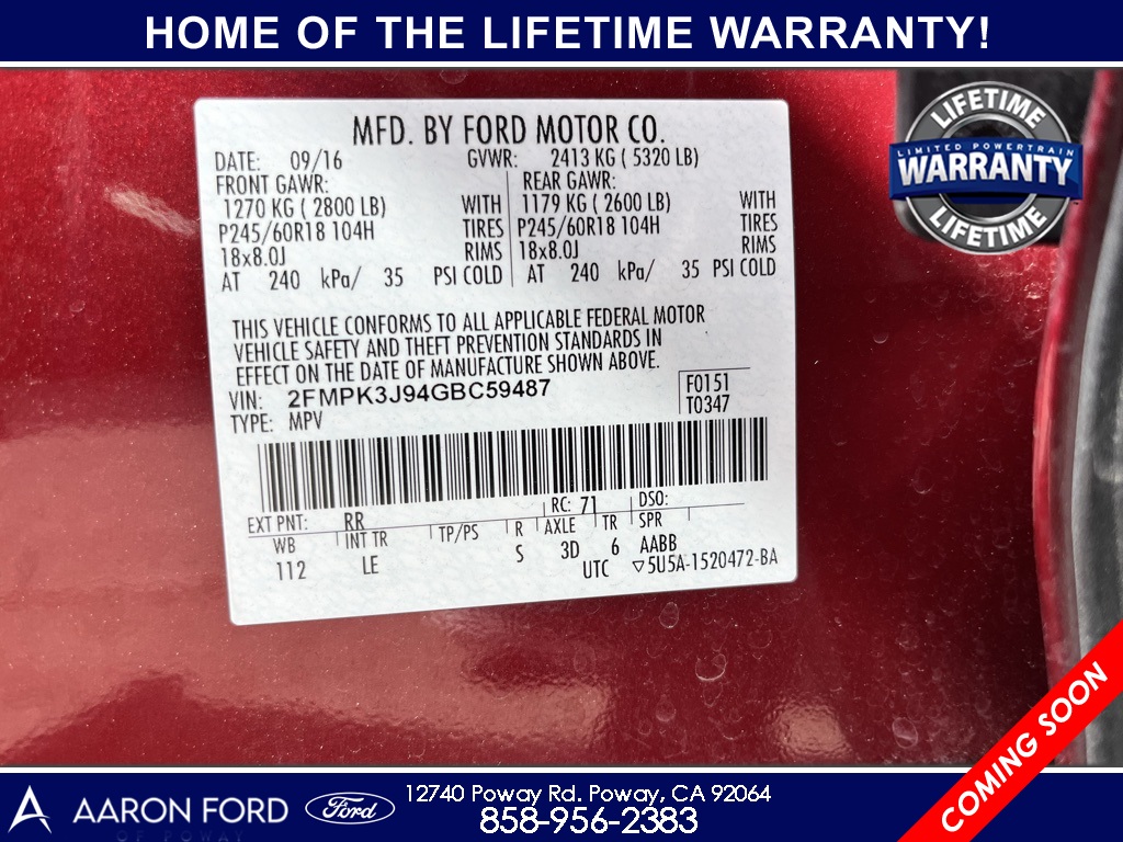 Technology Package, Premium 9 Speaker Audio, Radio: AM/FM Stereo w/Single CD/Navigation, BLIS Blind Spot Information System, Equipment Group 201A, Foot-Activated Hands-Free PoAuto-Dimming Driver's Sideview Mirror, wer Liftgate, Leather-Trimmed Heated Bucket Seats, Perimeter Alarm, Power Converter 110V Outlet, Remote Start System, SiriusXM Radio, SiriusXM Traffic & Travel Link, SYNC 3, Universal Garage Door Opener, Utility Package.21/30 City/Highway MPGCARFAX One-Owner.Clean CARFAX.To see more quality vehicles like this one right just click on AaronFordofPoway.com or dial (858) 748-1400.Awards: * 2016 KBB.com Brand Image Awards