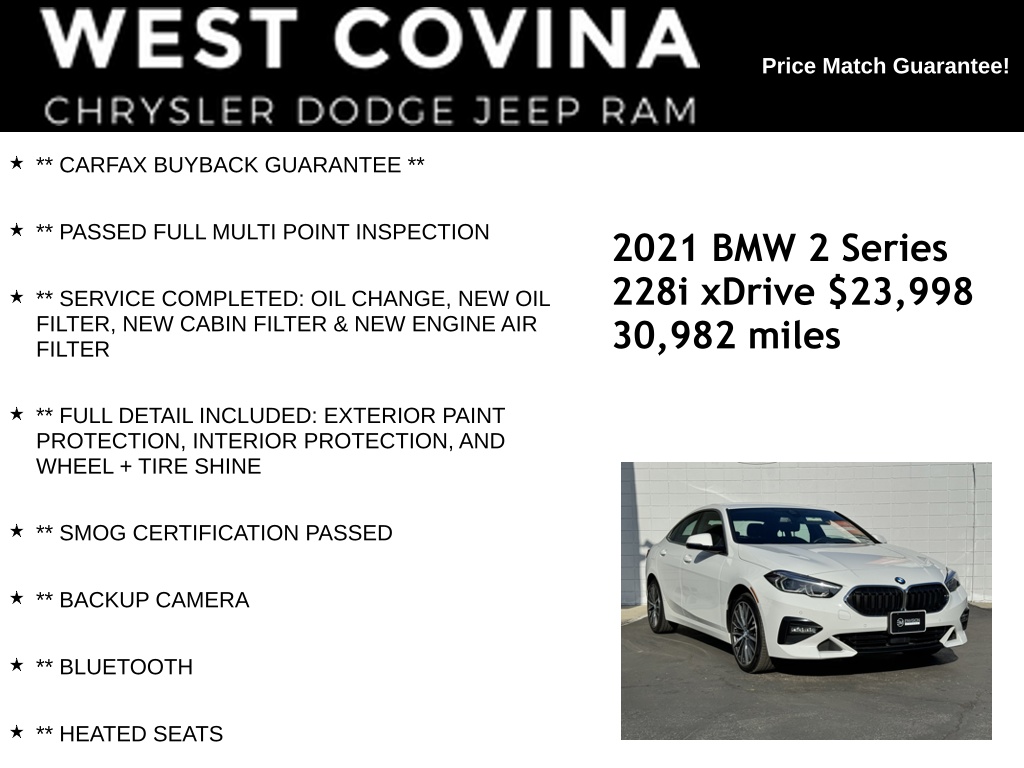 ** SPORT LINE **** CONNECTED PACKAGE PRO **** ACTIVE BLIND SPOT PROTECTION **** LANE DEPARTURE WARNING **** DRIVING ASSISTANCE PACKAGE **WE SPECIALIZE IN ALL CREDIT PROFILES! See what we can do for you! Call to find out (626) 899-9302.Recent Arrival! Clean CARFAX.23/33 City/Highway MPG ** PASSED FULL MULTI POINT INSPECTION, ** SERVICE COMPLETED: OIL CHANGE, NEW OIL FILTER, NEW CABIN FILTER & NEW ENGINE AIR FILTER, ** FULL DETAIL INCLUDED: EXTERIOR PAINT PROTECTION, INTERIOR PROTECTION, AND WHEEL + TIRE SHINE, ** SMOG CERTIFICATION PASSED, ** BACKUP CAMERA, ** BLUETOOTH, ** APPLE CAR PLAY/ ANDROID AUTO.White2021 BMW 2 Series 228i xDrive AWD 8-Speed Automatic 2.0L 4-Cylinder**********All Pricing and Advertised Prices for any/all vehicles offered for sale does not include dealer installed accessories which can be purchased for an additional cost.********** The Factory Rebates may not be available on this vehicle if you elect to take advantage of a Special Alternative APR or Special Lease program. Some Factory Rebates are California Resident specific and may vary for residents of other states. NO sales to Dealers, Brokers or Exporters. For out of state purchase, customers must be present to purchase. If shipping is required, dealership must facilitate; no exceptions. Please contact us for special Multi-Vehicle or Fleet pricing. Prices are plus government fees and taxes, any finance charges, $85 documentary fee, $29 electronic registration fee, any emission testing charge and $1.75 per new tire state tire fee. *** We make every effort to provide accurate information, but please verify before purchasing. Leasing & financing available on approved credit. Trade-ins accepted. Subject to prior sale.Awards: * JD Power Initial Quality Study (IQS)