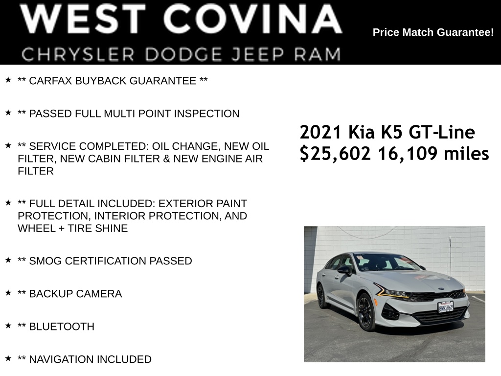 WE SPECIALIZE IN ALL CREDIT PROFILES! See what we can do for you! Call to find out (626) 899-9302.CARFAX One-Owner. Clean CARFAX.27/37 City/Highway MPG ** CARFAX BUYBACK GUARANTEE **, ** PASSED FULL MULTI POINT INSPECTION, ** SERVICE COMPLETED: OIL CHANGE, NEW OIL FILTER, NEW CABIN FILTER & NEW ENGINE AIR FILTER, ** FULL DETAIL INCLUDED: EXTERIOR PAINT PROTECTION, INTERIOR PROTECTION, AND WHEEL + TIRE SHINE, ** SMOG CERTIFICATION PASSED, ** BACKUP CAMERA, ** BLUETOOTH, ** NAVIGATION INCLUDED, ** BLIND SPOT MONITORS, ** APPLE CAR PLAY/ ANDROID AUTO, 6 Speakers, Forward Collision Avoidance-Assist - Cyclist, Forward Collision Avoidance-Assist - Junction Turn, Gloss Black Pillar & Door Frame Cover, GT-Line FWD Premium Package, LED Interior Lighting, LED Projection Headlights, Panoramic Sunroof, Radio data system, Smart Cruise Control w/Stop & Go, Wireless Charger.Wolf Gray2021 Kia K5 GT-Line FWD 8-Speed Automatic 1.6L I4 DGI**********All Pricing and Advertised Prices for any/all vehicles offered for sale does not include dealer installed accessories which can be purchased for an additional cost.********** The Factory Rebates may not be available on this vehicle if you elect to take advantage of a Special Alternative APR or Special Lease program. Some Factory Rebates are California Resident specific and may vary for residents of other states. NO sales to Dealers, Brokers or Exporters. For out of state purchase, customers must be present to purchase. If shipping is required, dealership must facilitate; no exceptions. Please contact us for special Multi-Vehicle or Fleet pricing. Prices are plus government fees and taxes, any finance charges, $85 documentary fee, $29 electronic registration fee, any emission testing charge and $1.75 per new tire state tire fee. *** We make every effort to provide accurate information, but please verify before purchasing. Leasing & financing available on approved credit. Trade-ins accepted. Subject to prior sale.