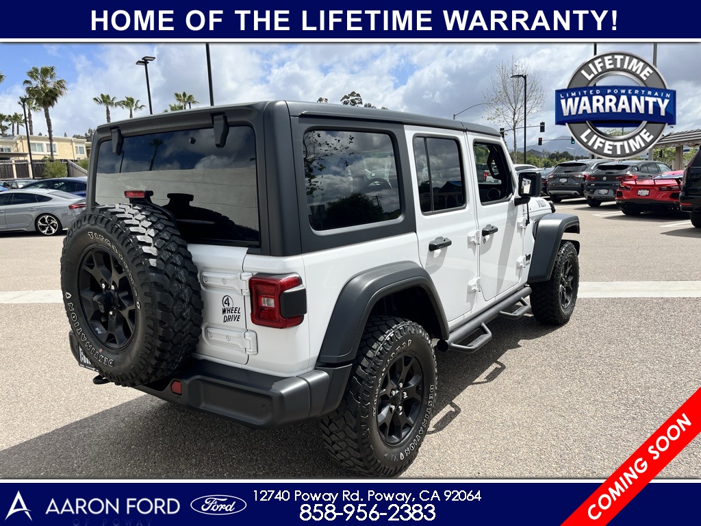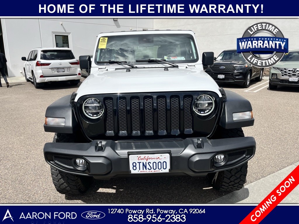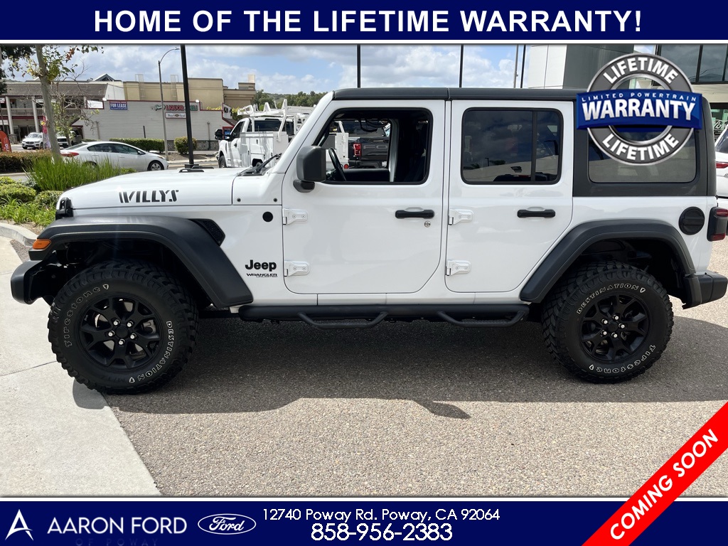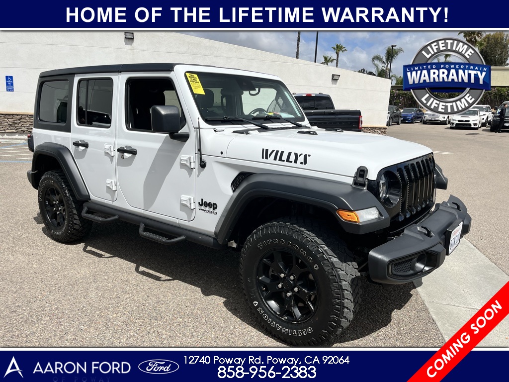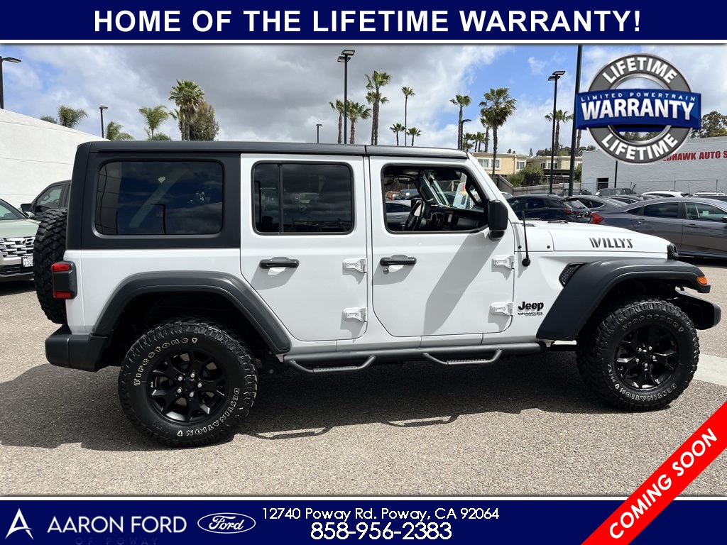 1-Year SiriusXM Radio Service, 4-Wheel Drive Swing Gate Decal, 7.0" Touchscreen Display, Advanced Brake Assist, Advanced Safety Group, Air Conditioning w/Auto Temperature Control, Air Filtering, Anti-Lock 4-Wheel Disc HD Brakes, Anti-Spin Differential Rear Axle, Apple CarPlay, Automatic Headlamps, Black 3-Piece Hard Top, Black Grille, Black Trail Rated Badge, Blind Spot & Cross Path Detection, Bridgestone Brand Tires, Cluster 7.0" TFT Color Display, Cold Weather Group, Convenience Group, Deep Tint Sunscreen Windows, Freedom Panel Storage Bag, Front 1-Touch Down Power Windows, Front LED Fog Lamps, Full Speed Forward Collision Warning Plus, Google Android Auto, GPS Antenna Input, Heated Front Seats, Heated Steering Wheel, Injection Molded Black Rear Bumper, Integrated Center Stack Radio, Leather Wrapped Steering Wheel, LED Headlamp & Fog Lamp Group, LED Reflector Headlamps, LED Taillamps, Matte Black Jeep Badge, MOPAR All-Weather Floor Mats, MOPAR Hardtop Headliner, No Soft Top, ParkSense Rear Park Assist System, ParkView Rear Back-Up Camera, Power Heated Mirrors, Quick Order Package 26W Willys, Radio: Uconnect 4 w/7" Display, Rear Window Defroster, Rear Window Wiper/Washer, Remote Keyless Entry, Safety Group, Security Alarm, SiriusXM Satellite Radio, Speed Sensitive Power Locks, Sun Visors w/Illuminated Vanity Mirrors, Technology Group, Universal Garage Door Opener, USB Host Flip, Wheels: 17" x 7.5" Moab Black Aluminum, Willys, Willys Hood Decal, Wrangler Decal.22/29 City/Highway MPGCARFAX One-Owner.To see more quality vehicles like this one right just click on AaronFordofPoway.com or dial (858) 748-1400.