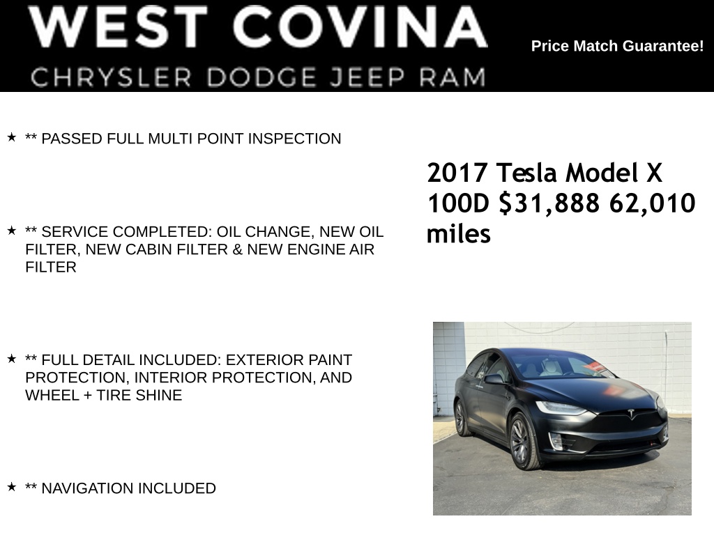 WE SPECIALIZE IN ALL CREDIT PROFILES! See what we can do for you! Call to find out (626) 899-9302.Recent Arrival! Clean CARFAX.Odometer is 1294 miles below market average! ** PASSED FULL MULTI POINT INSPECTION, ** SERVICE COMPLETED: OIL CHANGE, NEW OIL FILTER, NEW CABIN FILTER & NEW ENGINE AIR FILTER, ** FULL DETAIL INCLUDED: EXTERIOR PAINT PROTECTION, INTERIOR PROTECTION, AND WHEEL + TIRE SHINE, ** NAVIGATION INCLUDED, ABS brakes, Alloy wheels, Compass, Electronic Stability Control, Front Bucket Seats, Front Center Armrest, Front dual zone A/C, Heated door mirrors, Heated front seats, Illuminated entry, Low tire pressure warning, Navigation System, Power Liftgate, Power passenger seat, Remote keyless entry, Split folding rear seat, Traction control.MATT BLACK2017 Tesla Model X 100D AWD 1-Speed Automatic Electric Motor**********All Pricing and Advertised Prices for any/all vehicles offered for sale does not include dealer installed accessories which can be purchased for an additional cost.********** The Factory Rebates may not be available on this vehicle if you elect to take advantage of a Special Alternative APR or Special Lease program. Some Factory Rebates are California Resident specific and may vary for residents of other states. NO sales to Dealers, Brokers or Exporters. For out of state purchase, customers must be present to purchase. If shipping is required, dealership must facilitate; no exceptions. Please contact us for special Multi-Vehicle or Fleet pricing. Prices are plus government fees and taxes, any finance charges, $85 documentary fee, $29 electronic registration fee, any emission testing charge and $1.75 per new tire state tire fee. *** We make every effort to provide accurate information, but please verify before purchasing. Leasing & financing available on approved credit. Trade-ins accepted. Subject to prior sale.