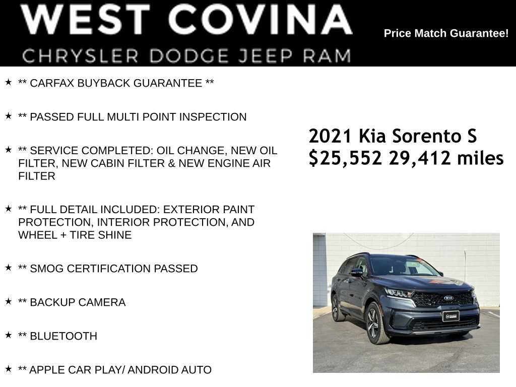 INDEPENDENCE DAY CELEBRATION HAS BEGUN. COME CHECK OUT OUR HARD TO BEAT INVENTORY PRICES. CALL (626) 899-9302 TO GET MORE INFORMATION** PANORAMIC SUNROOF PACKAGE **** BLIND-SPOT COLLISION-AVOIDANCE **WE SPECIALIZE IN ALL CREDIT PROFILES! See what we can do for you! Call to find out (626) 899-9302.Recent Arrival! CARFAX One-Owner. Clean CARFAX.24/29 City/Highway MPG ** PASSED FULL MULTI POINT INSPECTION, ** SERVICE COMPLETED: OIL CHANGE, NEW OIL FILTER, NEW CABIN FILTER & NEW ENGINE AIR FILTER, ** FULL DETAIL INCLUDED: EXTERIOR PAINT PROTECTION, INTERIOR PROTECTION, AND WHEEL + TIRE SHINE, ** SMOG CERTIFICATION PASSED, ** BACKUP CAMERA, ** BLUETOOTH, ** APPLE CAR PLAY/ ANDROID AUTO.Gray2021 Kia Sorento S FWD 8-Speed Automatic 2.5L I4 DGI DOHC 16V LEV3-ULEV70 191hp**********All Pricing and Advertised Prices for any/all vehicles offered for sale does not include dealer installed accessories which can be purchased for an additional cost.********** The Factory Rebates may not be available on this vehicle if you elect to take advantage of a Special Alternative APR or Special Lease program. Some Factory Rebates are California Resident specific and may vary for residents of other states. NO sales to Dealers, Brokers or Exporters. For out of state purchase, customers must be present to purchase. If shipping is required, dealership must facilitate; no exceptions. Please contact us for special Multi-Vehicle or Fleet pricing. Prices are plus government fees and taxes, any finance charges, $85 documentary fee, $29 electronic registration fee, any emission testing charge and $1.75 per new tire state tire fee. *** We make every effort to provide accurate information, but please verify before purchasing. Leasing & financing available on approved credit. Trade-ins accepted. Subject to prior sale.