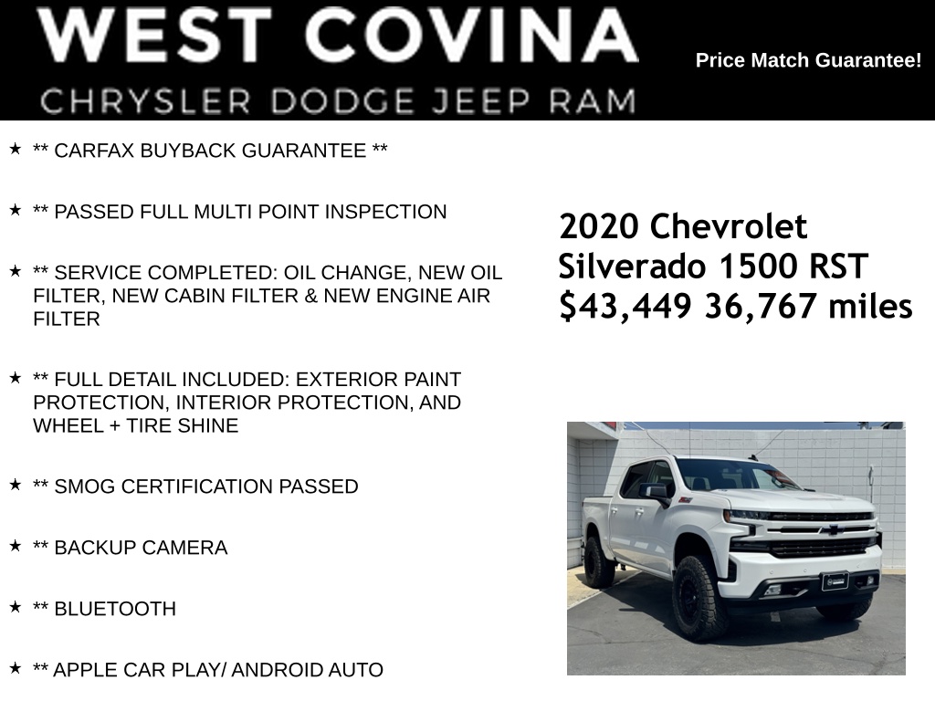 WE SPECIALIZE IN ALL CREDIT PROFILES! See what we can do for you! Call to find out (626) 899-9302.Recent Arrival! Clean CARFAX.Odometer is 21527 miles below market average! 23/29 City/Highway MPG ** CARFAX BUYBACK GUARANTEE **, ** PASSED FULL MULTI POINT INSPECTION, ** SERVICE COMPLETED: OIL CHANGE, NEW OIL FILTER, NEW CABIN FILTER & NEW ENGINE AIR FILTER, ** FULL DETAIL INCLUDED: EXTERIOR PAINT PROTECTION, INTERIOR PROTECTION, AND WHEEL + TIRE SHINE, ** SMOG CERTIFICATION PASSED, ** BACKUP CAMERA, ** BLUETOOTH, ** APPLE CAR PLAY/ ANDROID AUTO, 10-Speed Automatic, 4WD, Black Leather, 10-Way Power Driver Seat w/Lumbar, 12-Volt Rear Auxiliary Power Outlet, 120-Volt Bed Mounted Power Outlet, 120-Volt Instrument Panel Power Outlet, 2 USB Ports, 2 USB Ports (First Row), 4-Way Manual Driver Seat Adjuster, 4.2" Diagonal Color Display Driver Info Center, 4G LTE Wi-Fi Hot Spot Capable, 6-Speaker Audio System, Advanced Trailering Package, Advanced Trailering System, All-Star Edition, Bed Protection Package, Black Name Plates (LPO), Black Tailgate CHEVROLET Lettering (LPO), Bluetooth® For Phone, Body Color Grille, Chevrolet Connected Access Capable, Chevytec Spray-On Black Bedliner, Cloth Rear Seat w/Storage Package, Color-Keyed Carpeting Floor Covering, Compass, Convenience Package, Convenience Package II, Convenience Package w/Buckets Seats, Dark Essentials Package (LPO), Deep-Tinted Glass, Dual Exhaust w/Polished Outlets, Dual-Zone Automatic Climate Control, Electric Rear-Window Defogger, Electrical Lock Control Steering Column, Floor Mounted Center Console, Front Bucket Seats, Front Frame-Mounted Black Recovery Hooks, Front LED Fog Lamps, Front Rubberized Vinyl Floor Mats, HD Radio, HD Rear Vision Camera, Heated Driver & Front Outboard Passenger Seats, Heated Steering Wheel, Heavy-Duty Rear Locking Differential, High Capacity Air Filter, High Gloss Black Mirror Caps, Hill Descent Control, Hitch Guidance, Hitch Guidance w/Hitch View, Keyless Open & Start, Lane Change Alert w/Side Blind Zone Alert, Leather Package, Leather Wrapped Steering Wheel, LED Cargo Area Lighting, Manual Tilt-Wheel Steering Column, Manual Tilt/Telescoping Steering Column, Off-Road Suspension, OnStar & Chevrolet Connected Services Capable, Perforated Leather-Appointed Front Seat Trim, Perimeter Lighting, Power Door Locks, Power Front Windows w/Driver Express Up/Down, Power Front Windows w/Passenger Express Down, Power Rear Windows w/Express Down, Power Sliding Rear Window w/Rear Defogger, Preferred Equipment Group 1SP, Premium Bose 7-Speaker Sound System, Radio: Chevrolet Infotainment 3 Plus System, Rear 60/40 Folding Bench Seat (Folds Up), Rear Cross Traffic Alert, Rear Dual USB Charging-Only Ports, Rear Rubberized-Vinyl Floor Mats, Rear Vision Camera, Rear Wheelhouse Liners, Remote Vehicle Starter System, Safety Package, Single-Zone Manual/Semi-Automatic Air Conditioning, SiriusXM w/360L, Steering Wheel Audio Controls, Steering Wheel Mounted Electronic Cruise Control, Theft Deterrent System (Unauthorized Entry), Trailering Package, Ultrasonic Front & Rear Park Assist, Universal Home Remote, Up-Level Rear Seat w/Storage Package, Urethane Steering Wheel, Z71 Off-Road Package.Iridescent Pearl Tricoat2020 Chevrolet Silverado 1500 RST 4WD 10-Speed Automatic 3.0L I6**********All Pricing and Advertised Prices for any/all vehicles offered for sale does not include dealer installed accessories which can be purchased for an additional cost.********** The Factory Rebates may not be available on this vehicle if you elect to take advantage of a Special Alternative APR or Special Lease program. Some Factory Rebates are California Resident specific and may vary for residents of other states. NO sales to Dealers, Brokers or Exporters. For out of state purchase, customers must be present to purchase. If shipping is required, dealership must facilitate; no exceptions. Please contact us for special Multi-Vehicle or Fleet pricing. Prices are plus government fees and tax
