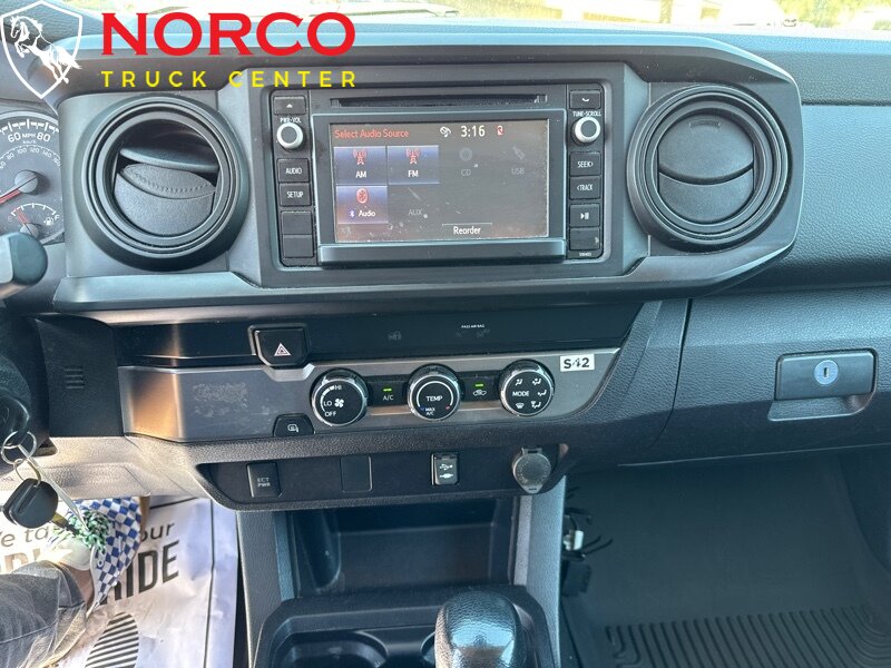 INSTALLED FEATURES: Air filtration, Front air conditioning, Front air conditioning zones: single, Airbag deactivation: occupant sensing passenger, Front airbags: dual, Knee airbags: dual front, Side airbags: front, Side curtain airbags: front / rear, Antenna type: mast, Auxiliary audio input: Bluetooth / USB / iPod/iPhone / jack, In-Dash CD: single disc, Radio: AM/FM / touch screen display / voice operated, Radio data system, Speed sensitive volume control, Total speakers: 6, ABS: 4-wheel, Braking assist, Electronic brakeforce distribution, Front brake diameter: 10.8, Front brake type: ventilated disc, Power brakes, Rear brake diameter: 10.0, Rear brake type: drum, Floor material: carpet, Shift knob trim: urethane, Steering wheel trim: urethane, Adaptive cruise control, Assist handle: front / rear, Center console: front console with armrest and storage, Cupholders: front / rear, One-touch windows: 1, Overhead console: front, Power outlet(s): 12V front, Power steering: variable/speed-proportional, Power windows: lockout button, Reading lights: front / rear, Rearview mirror: manual day/night, Steering wheel: tilt and telescopic, Steering wheel mounted controls: audio / cruise control / multi-function / phone / voice control, Storage: door pockets / front seatback / sunglasses holder / under rear seats, Sun visors, Axle ratio: 4.30, Battery: maintenance-free, Battery saver, Bumper detail: rear step, Door handle color: body-color, Exhaust tip color: stainless steel, Front bumper color: body-color, Grille color: black / black surround, Mirror color: body-color, Rear bumper color: body-color, Side door type: dual rear-hinged access, Skid plate(s): front, Tailgate: removable, Window trim: black, Infotainment: Entune, Infotainment screen size: 6.1 in., Clock, Digital odometer, External temperature display, Fuel economy display: MPG / range, Gauge: tachometer, Instrument cluster screen size: 4.2 in., Multi-function display, Trip odometer, Warnings and reminders: coolant temperature warning / lamp failure / low fuel level / low oil pressure / maintenance due, Daytime running lights, Headlights: auto delay off / auto high beam dimmer / halogen, Side mirror adjustments: manual folding / power, Side mirrors: heated, Active head restraints: dual front, Automatic emergency braking: front / front pedestrian, Camera system: rearview, Child seat anchors: LATCH system, Impact sensor: fuel cut-off, Lane deviation sensors, Pre-collision warning system: audible warning / pedestrian detection / visual warning, Rearview monitor: in dash, Safety brake pedal system, Emergency locking retractors: front / rear, Front seatbelts: 3-point, Rear seatbelts: 3-point, Seatbelt force limiters: front, Seatbelt pretensioners: front, Seatbelt warning sensor: front, Driver seat manual adjustments: lumbar / reclining / 4, Front headrests: adjustable / 2, Front seat type: bucket, Passenger seat manual adjustments: reclining / 4, Rear headrests: foldable / 2, Rear seat folding: folds up, Rear seat type: jumpseats, Upholstery: cloth, Anti-theft system: vehicle immobilizer, Power door locks: auto-locking, Hill holder control, Stability control, Traction control, Steering ratio: 17.4, Turns lock-to-lock: 3.40, Front shock type: gas, Front spring type: coil, Front stabilizer bar: diameter 30 mm, Front struts, Front suspension classification: independent, Front suspension type: double wishbone, Rear shock type: gas, Rear spring type: leaf, Rear stabilizer bar, Rear suspension classification: solid live axle, Rear suspension type: multi-leaf, Electronic messaging assistance: voice operated / with read function, Hands-free phone call integration: voice operated, Wireless data link: Bluetooth, Spare tire mount location: underbody, Spare tire size: full-size, Spare wheel type: steel, Tire Pressure Monitoring System, Tire type: all season, Wheels: steel, Pickup bed cargo management: tie-down anchors, Front wipers: intermittent, Pickup sliding rear window: manual, Power windows, Rear privacy glass