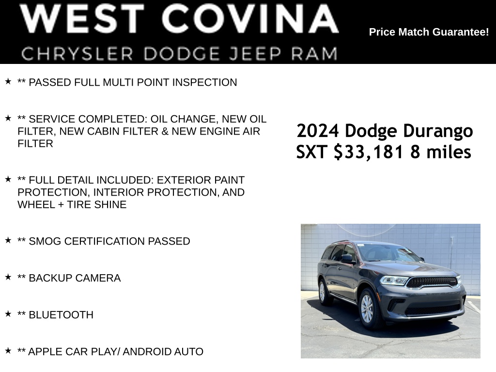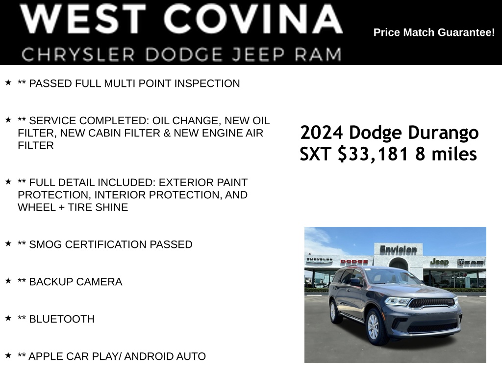 19/26 City/Highway MPG ** PASSED FULL MULTI POINT INSPECTION, ** SERVICE COMPLETED: OIL CHANGE, NEW OIL FILTER, NEW CABIN FILTER & NEW ENGINE AIR FILTER, ** FULL DETAIL INCLUDED: EXTERIOR PAINT PROTECTION, INTERIOR PROTECTION, AND WHEEL + TIRE SHINE, ** SMOG CERTIFICATION PASSED, ** BACKUP CAMERA, ** BLUETOOTH, ** APPLE CAR PLAY/ ANDROID AUTO.Vapor Gray2024 Dodge Durango SXT RWD 8-Speed Automatic 3.6L V6 24V VVT Price includes: $2930 - 2024 National Power Dollars Bonus Cash. Exp. 07/01/2024