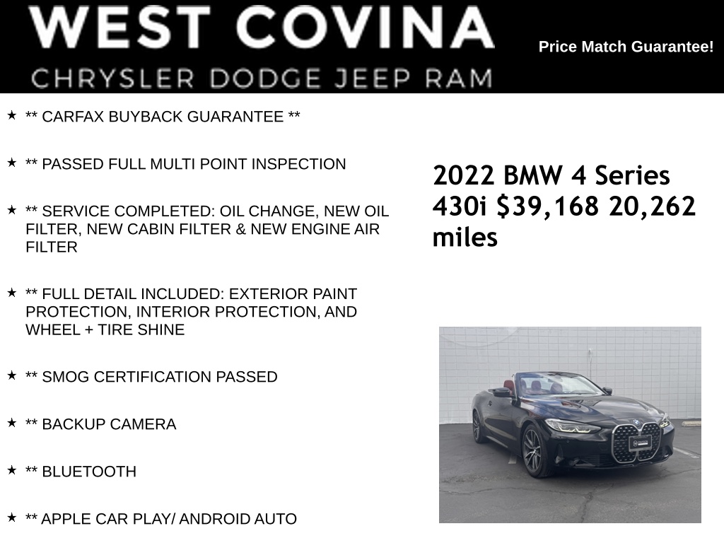 MEMORIAL DAY SALES EVENT HAS STARTED!!! COME CHECK OUT OUR HARD TO BEAT INVENTORY PRICES THAT HAVE BEEN REDUCED TO SAVE YOU MONEY. CALL (626) 899-9302 TO GET MORE INFORMATIONWE SPECIALIZE IN ALL CREDIT PROFILES! See what we can do for you! Call to find out (626) 899-9302.Recent Arrival! CARFAX One-Owner. Clean CARFAX.Odometer is 6969 miles below market average! 25/34 City/Highway MPG ** CARFAX BUYBACK GUARANTEE **, ** PASSED FULL MULTI POINT INSPECTION, ** SERVICE COMPLETED: OIL CHANGE, NEW OIL FILTER, NEW CABIN FILTER & NEW ENGINE AIR FILTER, ** FULL DETAIL INCLUDED: EXTERIOR PAINT PROTECTION, INTERIOR PROTECTION, AND WHEEL + TIRE SHINE, ** SMOG CERTIFICATION PASSED, ** BACKUP CAMERA, ** BLUETOOTH, ** APPLE CAR PLAY/ ANDROID AUTO, Comfort Access Keyless Entry, Connected Package Pro, Convenience Package, Lumbar Support.Jet Black2022 BMW 4 Series 430i RWD 8-Speed Automatic Sport 2.0L 4-Cylinder TwinPower Turbo**********All Pricing and Advertised Prices for any/all vehicles offered for sale does not include dealer installed accessories which can be purchased for an additional cost.********** The Factory Rebates may not be available on this vehicle if you elect to take advantage of a Special Alternative APR or Special Lease program. Some Factory Rebates are California Resident specific and may vary for residents of other states. NO sales to Dealers, Brokers or Exporters. For out of state purchase, customers must be present to purchase. If shipping is required, dealership must facilitate; no exceptions. Please contact us for special Multi-Vehicle or Fleet pricing. Prices are plus government fees and taxes, any finance charges, $85 documentary fee, $29 electronic registration fee, any emission testing charge and $1.75 per new tire state tire fee. *** We make every effort to provide accurate information, but please verify before purchasing. Leasing & financing available on approved credit. Trade-ins accepted. Subject to prior sale.