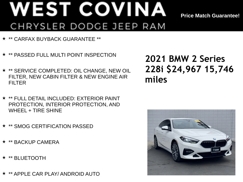 MEMORIAL DAY SALES EVENT HAS STARTED!!! COME CHECK OUT OUR HARD TO BEAT INVENTORY PRICES THAT HAVE BEEN REDUCED TO SAVE YOU MONEY. CALL (626) 899-9302 TO GET MORE INFORMATIONWE SPECIALIZE IN ALL CREDIT PROFILES! See what we can do for you! Call to find out (626) 899-9302.Recent Arrival! CARFAX One-Owner. Clean CARFAX.24/33 City/Highway MPG ** PASSED FULL MULTI POINT INSPECTION, ** SERVICE COMPLETED: OIL CHANGE, NEW OIL FILTER, NEW CABIN FILTER & NEW ENGINE AIR FILTER, ** FULL DETAIL INCLUDED: EXTERIOR PAINT PROTECTION, INTERIOR PROTECTION, AND WHEEL + TIRE SHINE, ** SMOG CERTIFICATION PASSED, ** BACKUP CAMERA, ** BLUETOOTH, ** APPLE CAR PLAY/ ANDROID AUTO.White2021 BMW 2 Series 228i FWD 8-Speed Automatic 2.0L 4-Cylinder**********All Pricing and Advertised Prices for any/all vehicles offered for sale does not include dealer installed accessories which can be purchased for an additional cost.********** The Factory Rebates may not be available on this vehicle if you elect to take advantage of a Special Alternative APR or Special Lease program. Some Factory Rebates are California Resident specific and may vary for residents of other states. NO sales to Dealers, Brokers or Exporters. For out of state purchase, customers must be present to purchase. If shipping is required, dealership must facilitate; no exceptions. Please contact us for special Multi-Vehicle or Fleet pricing. Prices are plus government fees and taxes, any finance charges, $85 documentary fee, $29 electronic registration fee, any emission testing charge and $1.75 per new tire state tire fee. *** We make every effort to provide accurate information, but please verify before purchasing. Leasing & financing available on approved credit. Trade-ins accepted. Subject to prior sale.Awards: * JD Power Initial Quality Study (IQS)