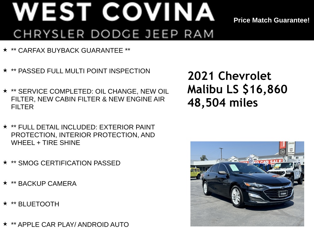 INDEPENDENCE DAY CELEBRATION HAS BEGUN. COME CHECK OUT OUR HARD TO BEAT INVENTORY PRICES. CALL (626) 899-9302 TO GET MORE INFORMATIONWE SPECIALIZE IN ALL CREDIT PROFILES! See what we can do for you! Call to find out (626) 899-9302.Recent Arrival! CARFAX One-Owner. Clean CARFAX.29/36 City/Highway MPG ** PASSED FULL MULTI POINT INSPECTION, ** SERVICE COMPLETED: OIL CHANGE, NEW OIL FILTER, NEW CABIN FILTER & NEW ENGINE AIR FILTER, ** FULL DETAIL INCLUDED: EXTERIOR PAINT PROTECTION, INTERIOR PROTECTION, AND WHEEL + TIRE SHINE, ** SMOG CERTIFICATION PASSED, ** BACKUP CAMERA, ** BLUETOOTH, ** APPLE CAR PLAY/ ANDROID AUTO.Black2021 Chevrolet Malibu LS FWD CVT 1.5L DOHC**********All Pricing and Advertised Prices for any/all vehicles offered for sale does not include dealer installed accessories which can be purchased for an additional cost.********** The Factory Rebates may not be available on this vehicle if you elect to take advantage of a Special Alternative APR or Special Lease program. Some Factory Rebates are California Resident specific and may vary for residents of other states. NO sales to Dealers, Brokers or Exporters. For out of state purchase, customers must be present to purchase. If shipping is required, dealership must facilitate; no exceptions. Please contact us for special Multi-Vehicle or Fleet pricing. Prices are plus government fees and taxes, any finance charges, $85 documentary fee, $29 electronic registration fee, any emission testing charge and $1.75 per new tire state tire fee. *** We make every effort to provide accurate information, but please verify before purchasing. Leasing & financing available on approved credit. Trade-ins accepted. Subject to prior sale.