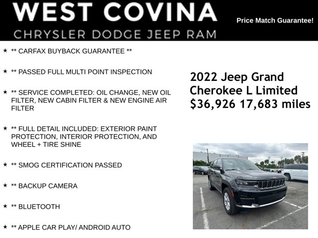 INDEPENDENCE DAY CELEBRATION HAS BEGUN. COME CHECK OUT OUR HARD TO BEAT INVENTORY PRICES. CALL (626) 899-9302 TO GET MORE INFORMATIONWE SPECIALIZE IN ALL CREDIT PROFILES! See what we can do for you! Call to find out (626) 899-9302.Recent Arrival!** PASSED FULL MULTI POINT INSPECTION, ** SERVICE COMPLETED: OIL CHANGE, NEW OIL FILTER, NEW CABIN FILTER & NEW ENGINE AIR FILTER, ** FULL DETAIL INCLUDED: EXTERIOR PAINT PROTECTION, INTERIOR PROTECTION, AND WHEEL + TIRE SHINE, ** SMOG CERTIFICATION PASSED, ** BACKUP CAMERA, ** BLUETOOTH, ** APPLE CAR PLAY/ ANDROID AUTO.Black2022 Jeep Grand Cherokee L Limited 4WD 8-Speed Automatic 3.6L V6 24V VVT**********All Pricing and Advertised Prices for any/all vehicles offered for sale does not include dealer installed accessories which can be purchased for an additional cost.********** The Factory Rebates may not be available on this vehicle if you elect to take advantage of a Special Alternative APR or Special Lease program. Some Factory Rebates are California Resident specific and may vary for residents of other states. NO sales to Dealers, Brokers or Exporters. For out of state purchase, customers must be present to purchase. If shipping is required, dealership must facilitate; no exceptions. Please contact us for special Multi-Vehicle or Fleet pricing. Prices are plus government fees and taxes, any finance charges, $85 documentary fee, $29 electronic registration fee, any emission testing charge and $1.75 per new tire state tire fee. *** We make every effort to provide accurate information, but please verify before purchasing. Leasing & financing available on approved credit. Trade-ins accepted. Subject to prior sale.