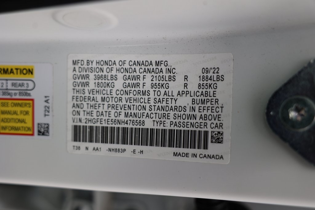 Civic Si, 4D Sedan, 1.5L I4 DOHC 16V, 6-Speed Manual, FWD, Gone Cloth, 12 Speakers, Alloy wheels, Apple CarPlay/Android Auto, Blind Spot Information (BSI) System warning, Brake assist, Electronic Stability Control, Exterior Parking Camera Rear, Forward collision: Collision Mitigation Braking System (CMBS) + FCW mitigation, Front dual zone A/C, Fully automatic headlights, Knee airbag, Low tire pressure warning, Remote keyless entry.Odometer is 13023 miles below market average!27/37 City/Highway MPGAwards: * NACTOY 2022 North American Car of the Year