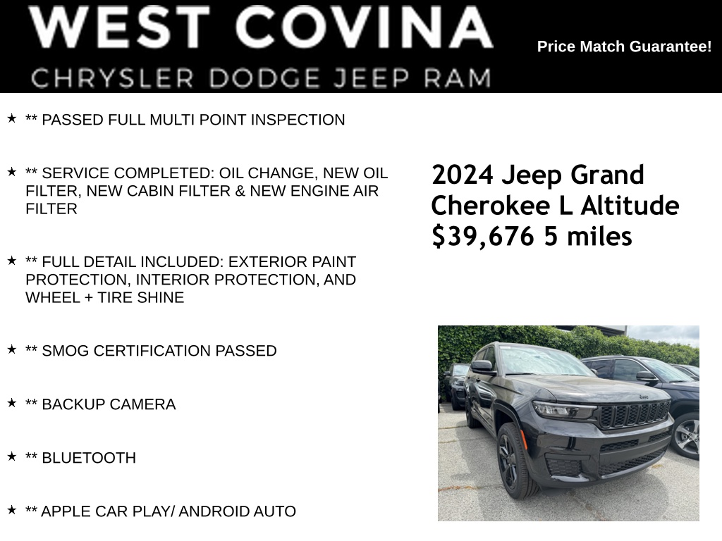 ** PASSED FULL MULTI POINT INSPECTION, ** SERVICE COMPLETED: OIL CHANGE, NEW OIL FILTER, NEW CABIN FILTER & NEW ENGINE AIR FILTER, ** FULL DETAIL INCLUDED: EXTERIOR PAINT PROTECTION, INTERIOR PROTECTION, AND WHEEL + TIRE SHINE, ** SMOG CERTIFICATION PASSED, ** BACKUP CAMERA, ** BLUETOOTH, ** APPLE CAR PLAY/ ANDROID AUTO.Diamond Black Crystal Pearlcoat2024 Jeep Grand Cherokee L Altitude 4WD 8-Speed Automatic 3.6L V6 24V VVT Price includes: $1500 - 2024 JEEP California BC Retail Consumer Cash 71CR1. Exp. 06/03/2024 $500 - 2024 JEEP Retail Bonus Cash 24CRA1. Exp. 06/03/2024