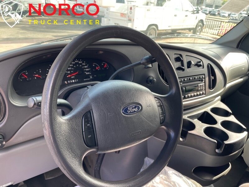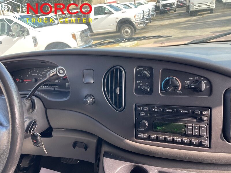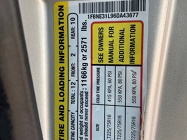 -- INSTALLED FEATURES: Front air conditioning, Rear air conditioning, Front airbags: dual, In-Dash CD: single disc, Radio: AM/FM, ABS: 4-wheel, Electronic brakeforce distribution, Front brake type: ventilated disc, Rear brake type: ventilated disc, Floor mat material: carpet, Floor mats: front, Cargo area light, Center console: front console with storage, Cruise control, Cupholders, Power outlet(s): front, Power steering, Reading lights: front, Steering wheel: tilt, Steering wheel mounted controls: cruise control, Storage: door pockets, Rear trunk/liftgate: barn, Side door type: passenger-side hinged swing-out, Clock, Gauge: tachometer, Warnings and reminders: low fuel level, Side mirror adjustments: power, OEM roof height: undefined, Child safety door locks, Child seat anchors, Rear seatbelts: center lap belt, Seatbelt pretensioners, Fourth row seat type: bench, Front headrests: adjustable, Front seat type: captains chairs, Rear seat type: bench, Third row seat type: bench, Upholstery: cloth, Anti-theft system: vehicle immobilizer, Power door locks, Front stabilizer bar, Front suspension classification: independent, Front suspension type: twin I-beam, Rear suspension classification: solid live axle, Spare tire mount location: underbody, Spare tire size: full-size, Tire prefix: LT, Tire type: all season, Wheel covers: full, Wheel diameter: 16 inch, Wheels: steel, Front wipers: intermittent, Power windows