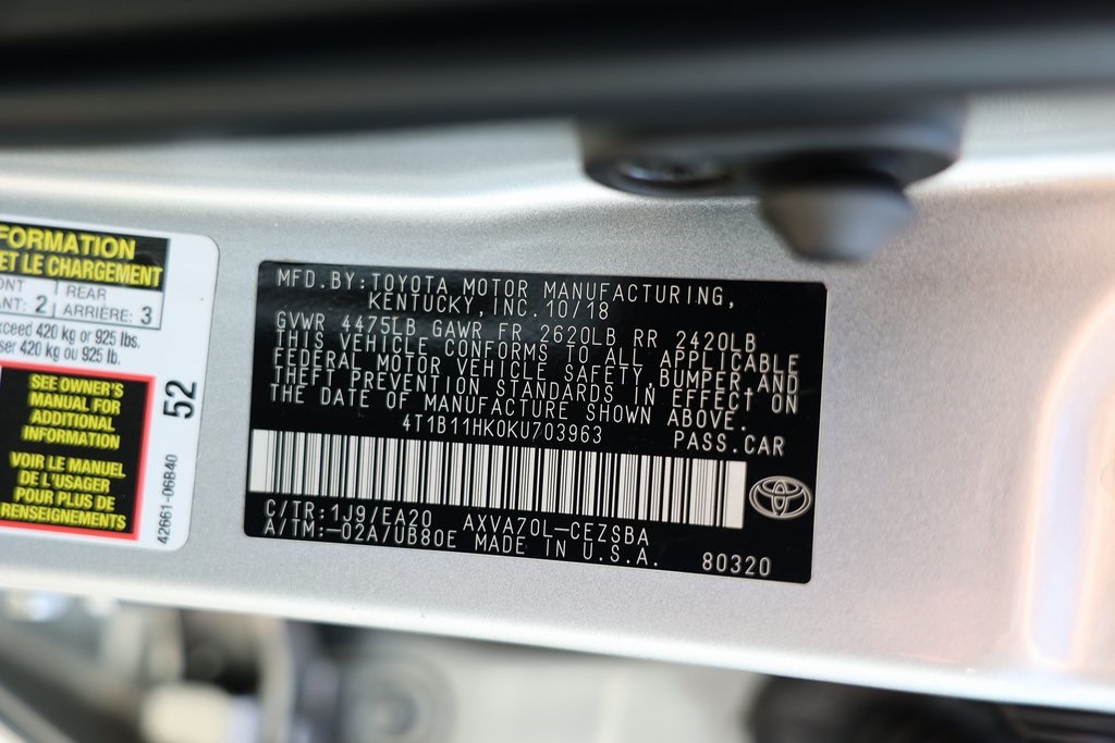 Celestial Silver Metallic 2019 Toyota Camry SE FWD 8-Speed Automatic 2.5L I4 DOHC 16V Se Cloth, 6 Speakers, Air Conditioning, Apple CarPlay, Brake assist, Electronic Stability Control, Exterior Parking Camera Rear, Fabric Seat Trim w/SofTex, Fully automatic headlights, Radio: Entune 3.0 Audio w/App Suite, Wheels: 8.0J x 18" Black Machined-Finish Alloy.Recent Arrival! Odometer is 14703 miles below market average! 28/39 City/Highway MPGAwards: * 2019 KBB.com 10 Best Sedans Under $30,000 * 2019 KBB.com 10 Most Comfortable Cars Under $30,000 * 2019 KBB.com Best Resale Value Awards * 2019 KBB.com Brand Image Awards