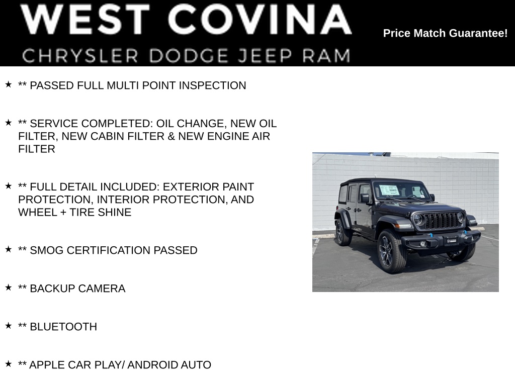 ** PASSED FULL MULTI POINT INSPECTION, ** SERVICE COMPLETED: OIL CHANGE, NEW OIL FILTER, NEW CABIN FILTER & NEW ENGINE AIR FILTER, ** FULL DETAIL INCLUDED: EXTERIOR PAINT PROTECTION, INTERIOR PROTECTION, AND WHEEL + TIRE SHINE, ** SMOG CERTIFICATION PASSED, ** BACKUP CAMERA, ** BLUETOOTH, ** APPLE CAR PLAY/ ANDROID AUTO, 2.0L I4 DOHC.Granite Crystal Metallic Clearcoat2024 Jeep Wrangler Sport S 4xe 4WD 8-Speed Automatic 2.0L I4 DOHC Price includes: $1000 - 2024 JR SFS Bonus Cash CACR1. Exp. 06/03/2024 $3000 - 2024 DJR National Retail Consumer Cash 24CR1. Exp. 06/03/2024