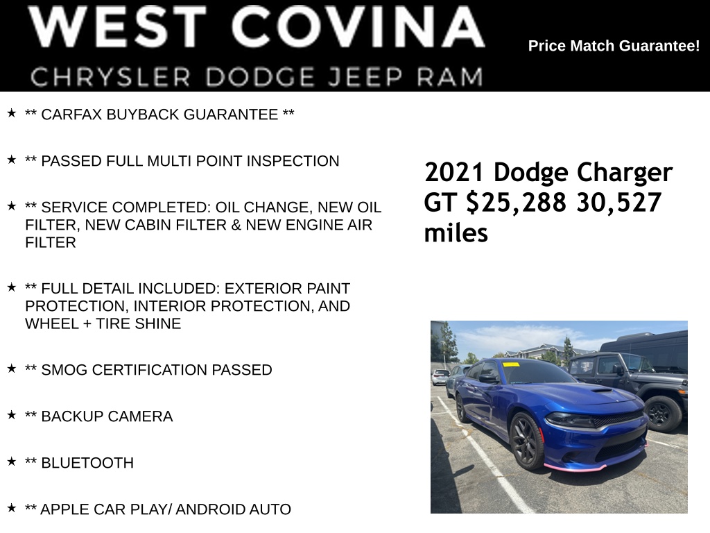 MEMORIAL DAY SALES EVENT HAS STARTED!!! COME CHECK OUT OUR HARD TO BEAT INVENTORY PRICES THAT HAVE BEEN REDUCED TO SAVE YOU MONEY. CALL (626) 899-9302 TO GET MORE INFORMATIONWE SPECIALIZE IN ALL CREDIT PROFILES! See what we can do for you! Call to find out (626) 899-9302.Recent Arrival! Clean CARFAX.Odometer is 8383 miles below market average! 19/30 City/Highway MPG ** PASSED FULL MULTI POINT INSPECTION, ** SERVICE COMPLETED: OIL CHANGE, NEW OIL FILTER, NEW CABIN FILTER & NEW ENGINE AIR FILTER, ** FULL DETAIL INCLUDED: EXTERIOR PAINT PROTECTION, INTERIOR PROTECTION, AND WHEEL + TIRE SHINE, ** SMOG CERTIFICATION PASSED, ** BACKUP CAMERA, ** BLUETOOTH, ** APPLE CAR PLAY/ ANDROID AUTO, Black Artificial Leather.Indigo Blue2021 Dodge Charger GT RWD 8-Speed Automatic 3.6L V6 24V VVT**********All Pricing and Advertised Prices for any/all vehicles offered for sale does not include dealer installed accessories which can be purchased for an additional cost.********** The Factory Rebates may not be available on this vehicle if you elect to take advantage of a Special Alternative APR or Special Lease program. Some Factory Rebates are California Resident specific and may vary for residents of other states. NO sales to Dealers, Brokers or Exporters. For out of state purchase, customers must be present to purchase. If shipping is required, dealership must facilitate; no exceptions. Please contact us for special Multi-Vehicle or Fleet pricing. Prices are plus government fees and taxes, any finance charges, $85 documentary fee, $29 electronic registration fee, any emission testing charge and $1.75 per new tire state tire fee. *** We make every effort to provide accurate information, but please verify before purchasing. Leasing & financing available on approved credit. Trade-ins accepted. Subject to prior sale.