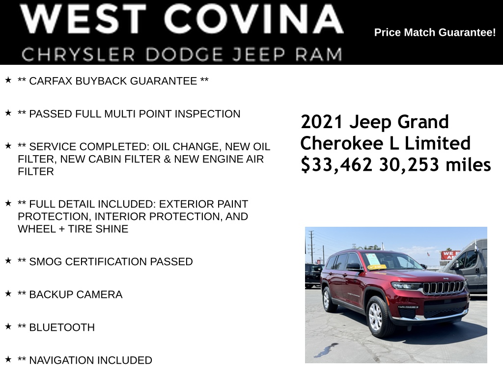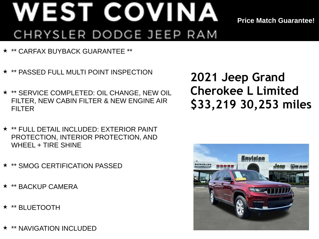 INDEPENDENCE DAY CELEBRATION HAS BEGUN. COME CHECK OUT OUR HARD TO BEAT INVENTORY PRICES. CALL (626) 899-9302 TO GET MORE INFORMATIONWE SPECIALIZE IN ALL CREDIT PROFILES! See what we can do for you! Call to find out (626) 899-9302.Recent Arrival! CARFAX One-Owner.19/26 City/Highway MPG ** CARFAX BUYBACK GUARANTEE **, ** PASSED FULL MULTI POINT INSPECTION, ** SERVICE COMPLETED: OIL CHANGE, NEW OIL FILTER, NEW CABIN FILTER & NEW ENGINE AIR FILTER, ** FULL DETAIL INCLUDED: EXTERIOR PAINT PROTECTION, INTERIOR PROTECTION, AND WHEEL + TIRE SHINE, ** SMOG CERTIFICATION PASSED, ** BACKUP CAMERA, ** BLUETOOTH, ** NAVIGATION INCLUDED, ** APPLE CAR PLAY/ ANDROID AUTO, Dual-Pane Panoramic Sunroof, GPS Navigation, Interior Rear Facing Camera, Quick Order Package 22E, Wheels: 20" x 8.5" Polished/Painted Aluminum.Velvet Red Pearlcoat2021 Jeep Grand Cherokee L Limited RWD 8-Speed Automatic 3.6L V6 24V VVT**********All Pricing and Advertised Prices for any/all vehicles offered for sale does not include dealer installed accessories which can be purchased for an additional cost.********** The Factory Rebates may not be available on this vehicle if you elect to take advantage of a Special Alternative APR or Special Lease program. Some Factory Rebates are California Resident specific and may vary for residents of other states. NO sales to Dealers, Brokers or Exporters. For out of state purchase, customers must be present to purchase. If shipping is required, dealership must facilitate; no exceptions. Please contact us for special Multi-Vehicle or Fleet pricing. Prices are plus government fees and taxes, any finance charges, $85 documentary fee, $29 electronic registration fee, any emission testing charge and $1.75 per new tire state tire fee. *** We make every effort to provide accurate information, but please verify before purchasing. Leasing & financing available on approved credit. Trade-ins accepted. Subject to prior sale.