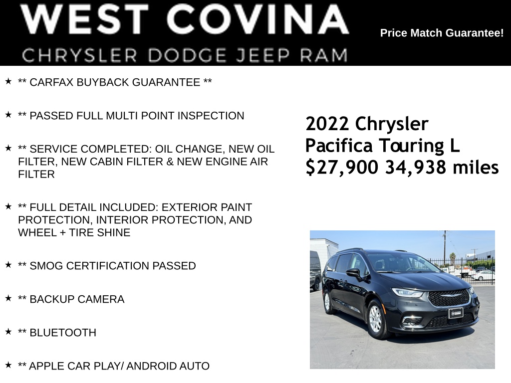 INDEPENDENCE DAY CELEBRATION HAS BEGUN. COME CHECK OUT OUR HARD TO BEAT INVENTORY PRICES. CALL (626) 899-9302 TO GET MORE INFORMATIONWE SPECIALIZE IN ALL CREDIT PROFILES! See what we can do for you! Call to find out (626) 899-9302.Recent Arrival! Certified. CARFAX One-Owner. Clean CARFAX.19/28 City/Highway MPG ** CARFAX BUYBACK GUARANTEE **, ** PASSED FULL MULTI POINT INSPECTION, ** SERVICE COMPLETED: OIL CHANGE, NEW OIL FILTER, NEW CABIN FILTER & NEW ENGINE AIR FILTER, ** FULL DETAIL INCLUDED: EXTERIOR PAINT PROTECTION, INTERIOR PROTECTION, AND WHEEL + TIRE SHINE, ** SMOG CERTIFICATION PASSED, ** BACKUP CAMERA, ** BLUETOOTH, ** APPLE CAR PLAY/ ANDROID AUTO, Quick Order Package 27L.Brilliant Black Crystal Pearlcoat2022 Chrysler Pacifica Touring L FWD 9-Speed 948TE Automatic 3.6L V6 24V VVTFCA US LLC Certified Pre-Owned Details: * Vehicle History * 125 Point Inspection * Includes First Day Rental, Car Rental Allowance, and Trip Interruption Benefits. SiriusXM 3 month trial subscription * Powertrain Limited Warranty: 84 Month/100,000 Mile (whichever comes first) from original in-service date * Roadside Assistance * Warranty Deductible: $100 * Limited Warranty: 3 Month/3,000 Mile (whichever comes first) after new car warranty expires or from certified purchase date * Transferable Warranty**********All Pricing and Advertised Prices for any/all vehicles offered for sale does not include dealer installed accessories which can be purchased for an additional cost.********** The Factory Rebates may not be available on this vehicle if you elect to take advantage of a Special Alternative APR or Special Lease program. Some Factory Rebates are California Resident specific and may vary for residents of other states. NO sales to Dealers, Brokers or Exporters. For out of state purchase, customers must be present to purchase. If shipping is required, dealership must facilitate; no exceptions. Please contact us for special Multi-Vehicle or Fleet pricing. Prices are plus government fees and taxes, any finance charges, $85 documentary fee, $29 electronic registration fee, any emission testing charge and $1.75 per new tire state tire fee. *** We make every effort to provide accurate information, but please verify before purchasing. Leasing & financing available on approved credit. Trade-ins accepted. Subject to prior sale.