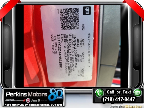 Red Mist Metallic Tintcoat RWD 6.2L V8 8 Speed Dual Clutch<br><br><br>Clean CARFAX.<br><br>Check us out at www.perkinsmotors.com to see our specials! Since opening our doors in 1944, we’ve been proud to serve Colorado Springs, CO, and the surrounding areas of Pueblo, Castle Rock and Denver, CO. Throughout this time of being family owned for 80 years, we’ve maintained a firm commitment to our customers: to offer a wide selection of New Chrysler, Dodge, Fiat, Jeep, and Ram vehicles and quality pre-owned vehicles, and provide a quick, no-hassle car-buying process that ensures everyone drives off the lot satisfied with their purchase.<br><br><br>Awards:<br> * Car and Driver 10 Best<br>Car and Driver, January 2017.<br><br>Carbon Flash Metallic Painted Outside Mirrors (Carbon Flash Metallic-Painted Outside Mirrors), Custom Leather Wrapped Interior Package, Memory Driver & Passenger Convenience Package, Preferred Equipment Group 3LT (2 Cargo Nets, Driver Power Bolster Seat Adjuster, Electrical Theft Deterrent System, HD Front & Rear Vision Cameras, Head-Up Display, Heated & Vented Driver & Passenger Seats, Heated Steering Wheel, Passenger Power Bolster Seat Adjuster, Performance Data & Video Recorder, Power Driver Lumbar Control Seat Adjuster, Power Passenger Lumbar Control Seat Adjuster, Power-Adjustable Outside Heated Mirrors, Rear Cross Traffic Alert, Rear Park Assist, Side Blind Zone Alert, Sueded Microfiber-Wrapped Upper Interior Trim Pkg, Universal Home Remote, Vehicle Inclination Theft Deterrent Sensor, Vehicle Interior Movement Theft Deterrent Sensor, and Wireless Charging for Devices), Z51 Performance Package (Electronic Limited-Slip Differential, Heavy-Duty Cooling System, Performance Exhaust w/Stainless-Steel Tips, Performance Rear Axle Ratio, Rear Z51 Spoiler, Z51 Performance Brakes, and Z51 Performance Suspension), 14 Speakers, 4-Wheel Disc Brakes, 8-Way Power Driver Seat Adjuster, 8-Way Power Passenger Seat Adjuster, ABS brakes, Adrenaline Red Custom Leather Stitch, Air Conditioning, Alloy wheels, AM/FM radio: SiriusXM, Auto-dimming door mirrors, Auto-dimming Rear-View mirror, Automatic temperature control, Black Composite Rocker Extensions (LPO), Bose Performance Series Sound System w/14 Speakers, Brake assist, Bumpers: body-color, Carbon Fiber Interior Trim, Compass, Convertible HardTop, Convertible roof lining, Convertible Top w/Carbon Flash Nacelles & Roof, Cruise Control, Delay-off headlights, Driver door bin, Driver vanity mirror, Dual front impact airbags, Dual front side impact airbags, Edge Red-Painted Calipers, Electronic Stability Control, Emergency communication system: OnStar and Chevrolet connected services capable, Four wheel independent suspension, Front anti-roll bar, Front Bucket Seats, Front Center Armrest, Front dual zone A/C, Front License Plate Bracket, Front Lift Adjustable Height w/Memory, Front reading lights, Fully automatic headlights, Garage door transmitter, Glass rear window, GT2 Bucket Seats, HD Radio, Heads-Up Display, Heated door mirrors, Heated front seats, Heated steering wheel, Illuminated entry, Integrated roll-over protection, Leather Shift Knob, Leather steering wheel, Low tire pressure warning, Memory seat, Napa Lthr Seating Surfaces w/Perforated Inserts, Navigation System, Not Equipped w/Rear Park Assist (DISC), Occupant sensing airbag, Outside temperature display, Overhead console, Panic alarm, Passenger door bin, Passenger vanity mirror, Performance Traction Management, Power convertible roof, Power door mirrors, Power driver seat, Power passenger seat, Power steering, Power windows, Premium audio system: Chevrolet Infotainment 3 Premium, Premium Carpeted Floor Mats, Radio data system, Radio: Chevrolet Infotainment 3 Premium System, Rear anti-roll bar, Rear Parking Sensors, Rear window defroster, Remote keyless entry, Security system, SiriusXM Radio, Speed-sensing steering, Sport steering wheel, Steering wheel memory, Steering wheel mounted audio controls, Stingray R Logo