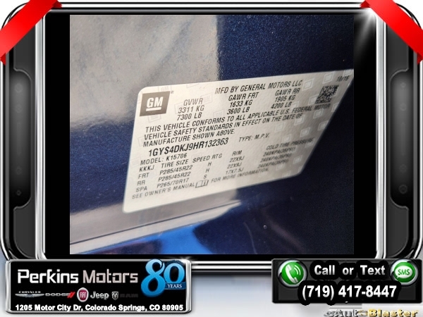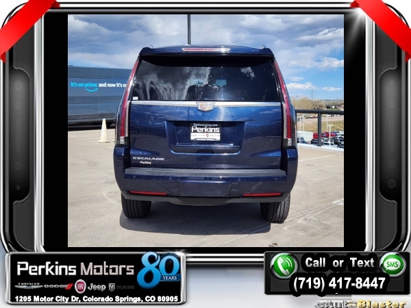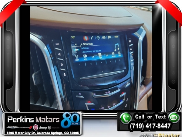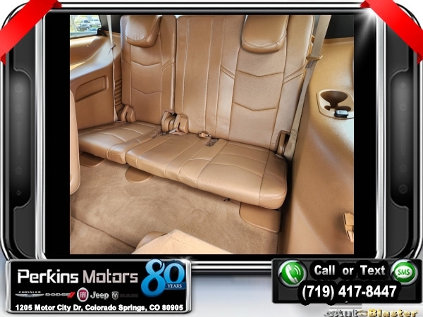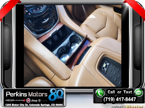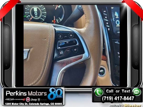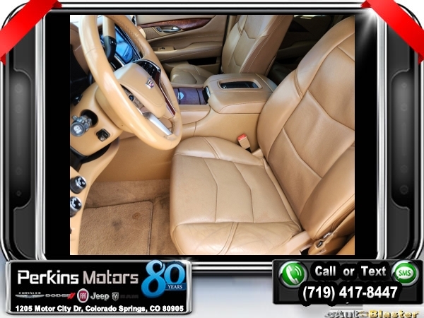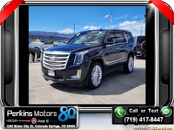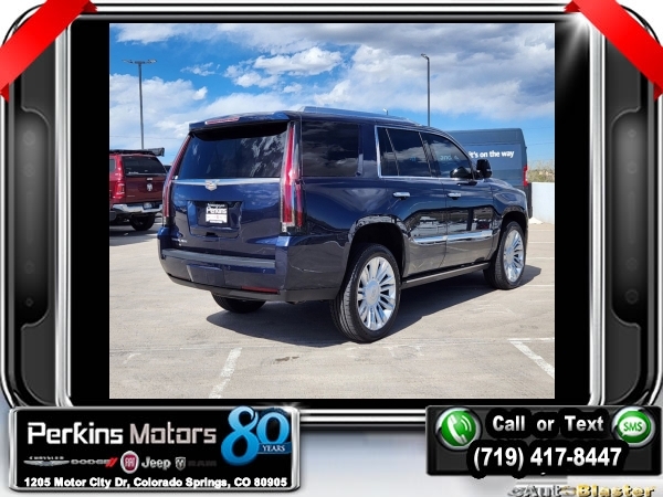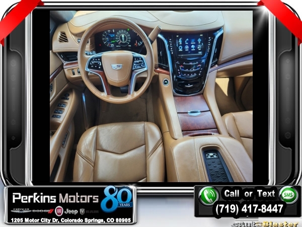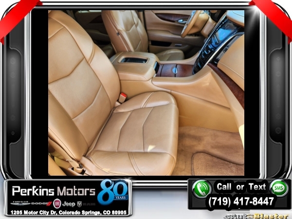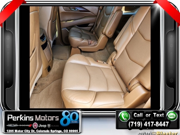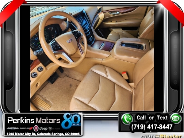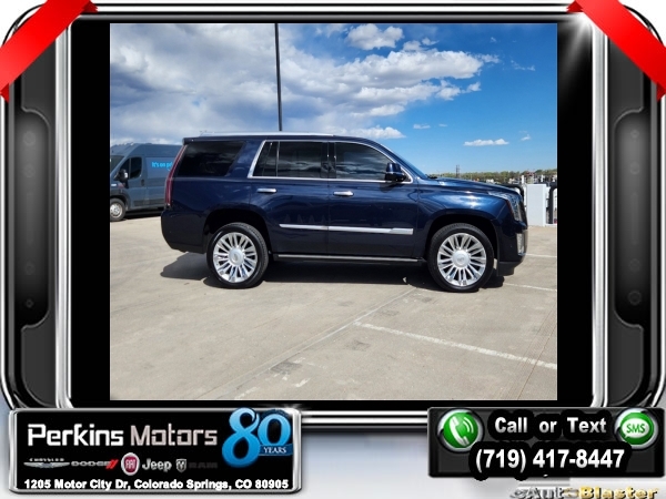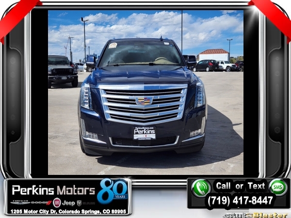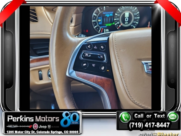 Dark Adriatic Blue Metallic 4WD 6.2L Variable Valve Timing V8 SIDI 8-Speed Automatic<br><br>4WD, Tuscan Brown Leather.<br><br><br>Clean CARFAX.<br><br>Check us out at www.perkinsmotors.com to see our specials! Since opening our doors in 1944, we’ve been proud to serve Colorado Springs, CO, and the surrounding areas of Pueblo, Castle Rock and Denver, CO. Throughout this time of being family owned for 80 years, we’ve maintained a firm commitment to our customers: to offer a wide selection of New Chrysler, Dodge, Fiat, Jeep, and Ram vehicles and quality pre-owned vehicles, and provide a quick, no-hassle car-buying process that ensures everyone drives off the lot satisfied with their purchase.<br><br>Reviews:<br> * More than enough power from the standard 6.2-liter V8 engine; luxurious cabin remains pleasantly quiet in nearly any circumstance; optional second-row bench increases seating capacity to eight; impressive towing abilities that most competitors can't match. Source: Edmunds<br><br><br>Awards:<br> * JD Power Automotive Performance, Execution and Layout (APEAL) Study * 2017 KBB.com 10 Best Luxury SUVs<br><br>Driver Assist Package (Adaptive Full-Speed Range Cruise Control, Automatic Safety Belt Tightening, Electronic Powered Parking Brake, and Front & Rear Automatic Braking), Platinum Package (Cooled Console w/Covered Storage, Dual DVD Screens, Leather Wrapped IP/Console/Door, Microfiber Sueded Headliner, Platinum Sill Plates, Premium Floor Mats, Unique Exotic Wood, and Unique Grille Design), Preferred Equipment Group 1SD (Forward Collision Alert, Illuminated Door Handles, IntelliBeam Headlamps, Lane Change Alert, Lane Keep Assist w/Lane Departure Warning, Power Tilt-Sliding Sunroof w/Express-Open/Close, Power-Retractable Assist Steps, Rear Camera Mirror, Rear Camera Washer, Rear Cross-Traffic Alert, Rear Seat Entertainment System, Reconfigurable 4-Color Head-Up Display, Second Row Bucket Seats, Side Blind Zone Alert, and VAC Power 17 Disc Brakes), Theft-Deterrent Package (Inclination Sensor, Theft-Deterrent Alarm System, and Vehicle Interior Movement Sensor), 4WD, Tuscan Brown Leather, 16 Speakers, 2-Position Memory For Driver's Seat Adjuster, 3.23 Axle Ratio, 3rd row seats: split-bench, 4-Wheel Disc Brakes, A/V remote, ABS brakes, Adaptive suspension, Adjustable pedals, Air Conditioning, Alloy wheels, AM/FM radio: SiriusXM, Apple CarPlay, Auto High-beam Headlights, Auto tilt-away steering wheel, Auto-dimming door mirrors, Auto-leveling suspension, Automatic temperature control, Black Front License Plate Bracket, Bodyside moldings, Bose Centerpoint Surround Sound System, Brake assist, Bumpers: body-color, CD player, Compass, Cruise Control, Delay-off headlights, Driver door bin, Driver vanity mirror, Dual front impact airbags, Dual front side impact airbags, DVD-Audio, Electronic Stability Control, Emergency communication system: OnStar Protection, Engine Block Heater, Exterior Parking Camera Rear, Front anti-roll bar, Front Bucket Seats, Front Center Armrest w/Storage, Front dual zone A/C, Front reading lights, Front wheel independent suspension, Fully automatic headlights, Garage door transmitter, Genuine wood dashboard insert, HD Radio, Headphones, Heads-Up Display, Heated & Cooled Front Bucket Seats, Heated door mirrors, Heated front seats, Heated rear seats, Heated steering wheel, Illuminated entry, Leather Shift Knob, Leather steering wheel, Low tire pressure warning, Magnetic Ride Control Suspension, Memory seat, Navigation System, NavTraffic, Occupant sensing airbag, Outside temperature display, Overhead airbag, Overhead console, Panic alarm, Passenger door bin, Passenger vanity mirror, Pedal memory, Power door mirrors, Power driver seat, Power Liftgate, Power moonroof, Power passenger seat, Power steering, Power windows, Radio data system, Radio: Cadillac CUE Info/Media Ctrl Sys w/Embd Nav, Rain sensing wipers, Rear air conditioning, Rear anti-roll bar, Rear audio controls, Rear reading lights, Rear window