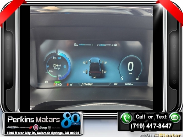 Gray Metallic AWD 2.0L I4 Electric OHV ZEV 426hp Single-Speed Automatic<br><br><br>CARFAX One-Owner. Clean CARFAX.<br><br>Check us out at www.perkinsmotors.com to see our specials! Since opening our doors in 1944, we’ve been proud to serve Colorado Springs, CO, and the surrounding areas of Pueblo, Castle Rock and Denver, CO. Throughout this time of being family owned for 80 years, we’ve maintained a firm commitment to our customers: to offer a wide selection of New Chrysler, Dodge, Fiat, Jeep, and Ram vehicles and quality pre-owned vehicles, and provide a quick, no-hassle car-buying process that ensures everyone drives off the lot satisfied with their purchase.<br><br><br>Equipment Group 311A Standard, Tow Technology Package (Pro Trailer Backup Assist), 4-Wheel Disc Brakes, ABS brakes, Air Conditioning, Alloy wheels, Auto High-beam Headlights, Auto-dimming Rear-View mirror, Automatic temperature control, Brake assist, Compass, Cruise Control, Delay-off headlights, Driver door bin, Driver vanity mirror, Dual front impact airbags, Dual front side impact airbags, Electronic Stability Control, Emergency communication system: SYNC 4 911 Assist, Four wheel independent suspension, Front anti-roll bar, Front Bucket Seats, Front Center Armrest, Front dual zone A/C, Front reading lights, Fully automatic headlights, Heated front seats, Inclination/Intrusion Sensor Removal, Low tire pressure warning, Mobile Power Cord (120/240V), Occupant sensing airbag, On-Board Scales & Smart Hitch Removal, Outside temperature display, Overhead airbag, Overhead console, Panic alarm, Passenger door bin, Passenger vanity mirror, Power steering, Power windows, Radio data system, Rear anti-roll bar, Rear step bumper, Remote keyless entry, Security system, Speed-sensing steering, Split folding rear seat, Steering Wheel Heat Removal (DISC), Steering wheel mounted audio controls, Telescoping steering wheel, Tilt steering wheel, Traction control, Trip computer, Variably intermittent wipers, and Wheels: 18 Machined w/Black High Gloss Pockets.