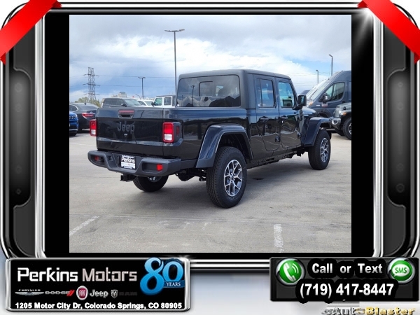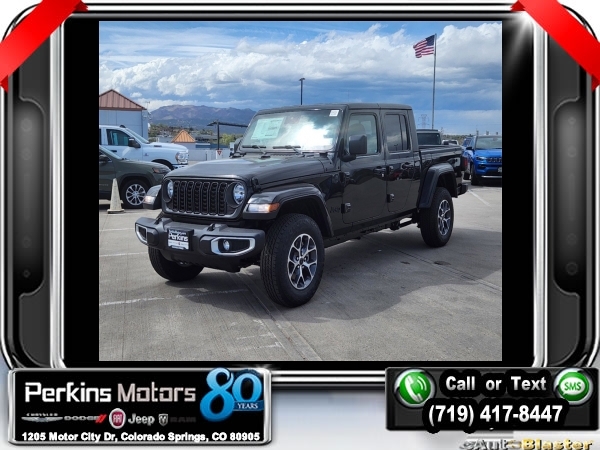 Factory MSRP: $55,250 $6,466 off MSRP! Black Clearcoat 2024 Jeep Gladiator Sport 4WD 8-Speed Automatic 3.6L V6 24V VVT<br><br>Check us out at www.perkinsmotors.com to see our specials! Since opening our doors in 1944, we’ve been proud to serve Colorado Springs, CO, and the surrounding areas of Pueblo, Castle Rock and Denver, CO. Throughout this time of being family owned for 80 years, we’ve maintained a firm commitment to our customers: to offer a wide selection of New Chrysler, Dodge, Fiat, Jeep, and Ram vehicles and quality pre-owned vehicles, and provide a quick, no-hassle car-buying process that ensures everyone drives off the lot satisfied with their purchase.<br><br>Convenience Group, Max Tow Package w/4.10 Axle Ratio (110 MPH Vehicle Max Speed Calibration, 240 Amp Alternator, 4.10 Rear Axle Ratio, Anti-Spin Differential Rear Axle, Black Molded-In-Color Fender Flares (2-Piece), Class IV Receiver Hitch, Dana M210 Wide Front Axle, and Daytime Running Lamp System), Quick Order Package 24S Sport S (Automatic Headlamps, Corning Gorilla Glass, Deep Tint Sunscreen Windows, Full Speed Forward Collision Warning Plus, Power Heated Mirrors, Speed Sensitive Power Locks, Sport S, Sun Visors w/Illuminated Vanity Mirrors, and Wheels: 17 x 7.5 Gray), Trailer Tow & Aux Switch Group (Auxiliary Switches and Trailer Hitch Zoom), 12.3 Touchscreen Display, 3.73 Rear Axle Ratio, 4-Wheel Disc Brakes, 4G LTE Wi-Fi Hot Spot, 8 Speakers, ABS brakes, Air Conditioning, Alexa Built-In, AM/FM radio: SiriusXM with 360L, Apple CarPlay, Apple CarPlay/Android Auto, Black 3-Piece Hard Top, Brake assist, Cloth Low-Back Bucket Seats, Compass, Connectivity - US/Canada, Cruise Control, Delay-off headlights, Disassociated Touchscreen Display, Driver door bin, Driver vanity mirror, Dual front impact airbags, Dual front side impact airbags, Electronic Stability Control, Emergency communication system: Jeep Connect, For Details, Visit DriveUconnect.com, For More Info, Call 800-643-2112, Freedom Panel Storage Bag, Front anti-roll bar, Front Bucket Seats, Front Center Armrest w/Storage, Front fog lights, Front License Plate Bracket, Front reading lights, Google Android Auto, Integrated Center Stack Radio, Integrated roll-over protection, Low tire pressure warning, Manufacturer's Statement of Origin, MOPAR All-Weather Slush Mats, MOPAR Spray In Bedliner, Normal Duty Suspension, Occupant sensing airbag, Outside temperature display, Overhead airbag, ParkView Rear Back-Up Camera, Passenger door bin, Passenger vanity mirror, Power steering, Radio data system, Radio: Uconnect 5 w/12.3 Display, Rear anti-roll bar, Rear reading lights, SiriusXM Radio Service, SiriusXM w/360L, Split folding rear seat, Steering wheel mounted audio controls, Tachometer, Telescoping steering wheel, Tilt steering wheel, Traction control, Trip computer, Variably intermittent wipers, Voltmeter, Wheels: 17 x 7.5 Black Steel Styled, and Wheels: 17 x 7.5 Machined w/Black PocketS. Sale price includes all manufacture's incentives and dealer discounts. Sale price not available on lease or compatible with special APR. $1000 - 2024 JR Denver BC Bonus Cash DECRA. Exp. 06/03/2024 $2000 - 2024 CJR Bonus Cash 24CRA. Exp. 06/03/2024