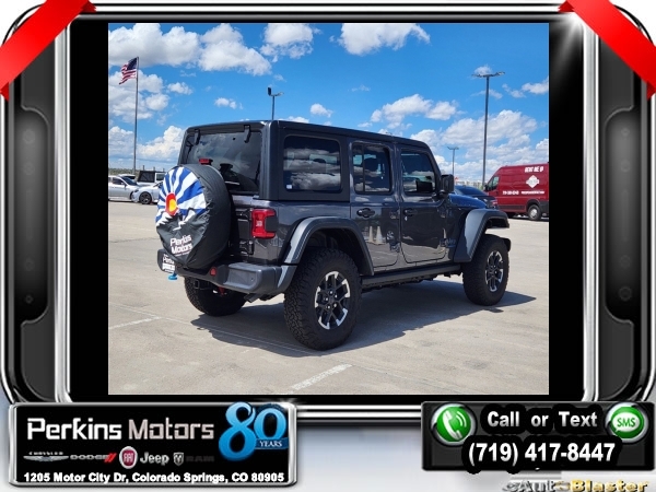 Factory MSRP: $69,225 $10,124 off MSRP! Priced below KBB Fair Purchase Price! Granite Crystal Metallic Clearcoat 2024 Jeep Wrangler Rubicon 4xe 4WD 8-Speed Automatic 2.0L I4 DOHC<br>2.0L I4 DOHC.<br>Check us out at www.perkinsmotors.com to see our specials! Since opening our doors in 1944, we’ve been proud to serve Colorado Springs, CO, and the surrounding areas of Pueblo, Castle Rock and Denver, CO. Throughout this time of being family owned for 80 years, we’ve maintained a firm commitment to our customers: to offer a wide selection of New Chrysler, Dodge, Fiat, Jeep, and Ram vehicles and quality pre-owned vehicles, and provide a quick, no-hassle car-buying process that ensures everyone drives off the lot satisfied with their purchase.<br><br>Convenience Group (Heated Front Seats and Universal Garage Door Opener), Quick Order Package 29V Rubicon, Safety Group, Technology Group (12.3 Touchscreen Display, 4G LTE Wi-Fi Hot Spot, Apple CarPlay, Connectivity - US/Canada, Disassociated Touchscreen Display, Google Android Auto, GPS Navigation, HD Radio, Integrated Center Stack Radio, Integrated Off-Road Camera, Integrated Voice Command w/Bluetooth, Radio: Uconnect 5 Nav w/12.3 Display, SiriusXM Radio Service, and SiriusXM w/360L), 2.0L I4 DOHC, 4-Wheel Disc Brakes, 4.10 Rear Axle Ratio, 8 Speakers, ABS brakes, Air Conditioning, Alloy wheels, AM/FM radio: SiriusXM, Apple CarPlay/Android Auto, Automatic temperature control, Black 3-Piece Hard Top, Brake assist, Compass, Cruise Control, Delay-off headlights, Driver door bin, Driver vanity mirror, Dual front impact airbags, Dual front side impact airbags, Electronic Stability Control, Freedom Panel Storage Bag, Front anti-roll bar, Front Bucket Seats, Front Center Armrest w/Storage, Front dual zone A/C, Front fog lights, Front reading lights, Fully automatic headlights, Garage door transmitter, Heated door mirrors, Illuminated entry, Integrated roll-over protection, Low tire pressure warning, MOPAR All-Weather Floor Mats, No Soft Top, Occupant sensing airbag, Outside temperature display, Overhead airbag, Panic alarm, ParkView Rear Back-Up Camera, Passenger door bin, Passenger vanity mirror, Performance Suspension, Power door mirrors, Power steering, Power windows, Radio data system, Radio: Uconnect 5 w/12.3 Display, Rear anti-roll bar, Rear reading lights, Remote keyless entry, Security system, Split folding rear seat, Steering wheel mounted audio controls, Sustainable Premium Cloth Seats, Tachometer, Telescoping steering wheel, Tilt steering wheel, Traction control, Trip computer, Variably intermittent wipers, Voltmeter, and Wheels: 17 x 7.5 Machined w/Black Pockets. Sale price includes all manufacture's incentives and dealer discounts. Sale price not available on lease or compatible with special APR. $3000 - 2024 DJR National Retail Consumer Cash 24CR1. Exp. 06/03/2024 $3750 - Federal EV Tax Credit. Exp. 12/31/2024