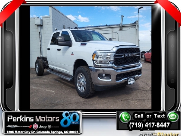 Factory MSRP: $73,175 $4,880 off MSRP! Bright White Clearcoat 2024 Ram 3500 Tradesman 4WD Aisin 6-Speed Automatic Cummins 6.7L I6 Turbodiesel<br><br>Check us out at www.perkinsmotors.com to see our specials! Since opening our doors in 1944, we’ve been proud to serve Colorado Springs, CO, and the surrounding areas of Pueblo, Castle Rock and Denver, CO. Throughout this time of being family owned for 80 years, we’ve maintained a firm commitment to our customers: to offer a wide selection of New Chrysler, Dodge, Fiat, Jeep, and Ram vehicles and quality pre-owned vehicles, and provide a quick, no-hassle car-buying process that ensures everyone drives off the lot satisfied with their purchase.<br><br>Chrome Appearance Group (Bright Front Bumper, Bright Wheel Skins, Center Hub, Chrome Grille Surround, Chrome Headlamp Bezels, and Matte Black Mesh Grille w/Chrome), Electrical Accessory Group (Voltage Monitoring Auto Idle Up System), Heavy Duty Snow Plow Prep Group, Quick Order Package 2YA Tradesman (Black Exterior Truck Badging, Black Key Fob, Door Sill Scuff Pads, Glove Box, Halogen Quad Headlamps, Map/Courtesy Lamp, Matte Black Grille Surround, Overhead Console, Overhead Cupholder Lamp, and Rear Dome Lamp), 102 mph Maximum Speed, 115V Auxiliary Power Outlet, 3.73 Axle Ratio, 4-Wheel Disc Brakes, 40/20/40 Split Bench Seat, 400W Inverter, 4G LTE Wi-Fi Hot Spot, 6 Speakers, 8.4 Touchscreen Display, ABS brakes, Air Conditioning, All R1 Low Radios, All Radio-Equipped Vehicles, Apple CarPlay, Bluetooth Handsfree Phone & Audio, Compass, Connectivity - US/Canada, Cruise Control, Delay-off headlights, Driver door bin, Dual front impact airbags, Electric Shift-On-The-Fly Transfer Case, Electronic Stability Control, For Details, Visit DriveUconnect.com, For More Info, Call 800-643-2112, Front anti-roll bar, Front Bucket Seats, Front Fog Lamps, Front License Plate Bracket, Fully automatic headlights, Global Telematics Box Module (TBM), Google Android Auto, GPS Antenna Input, HD Vinyl 40/20/40 Split Bench Seat, Heated door mirrors, Integrated Center Stack Radio, Integrated Voice Command w/Bluetooth, Manual Adjust 4-Way Driver Seat, Manual Adjust 4-Way Front Passenger Seat, Manual DPF Regeneration, Manufacturer's Statement of Origin, MOPAR Front & Rear Rubber Floor Mats, Occupant sensing airbag, Outside temperature display, Overhead console, ParkView Rear Back-Up Camera, Passenger door bin, Passenger vanity mirror, Power 2-Way Driver Lumbar Adjust, Power door mirrors, Power steering, Power windows, Radio data system, Radio: Uconnect 3 w/5 Display, Radio: Uconnect 5 w/8.4 Display, Rear anti-roll bar, Rear Backup Alarm, Rear Folding Seat, Rear Sliding Window, Remote Keyless Entry, Remote USB Port - Charge Only, SiriusXM Radio Service, SiriusXM Satellite Radio, Storage Tray, Tachometer, Temperature & Compass Gauge, Tilt steering wheel, Tow Hooks, Traction control, Trailer Brake Control, Trailer Light Check, Tubular Side Steps, Turn signal indicator mirrors, Variably intermittent wipers, Voltmeter, Wheels: 18 x 8.0 Steel, and Wheels: 18 x 8 Steel Chrome ClaD.