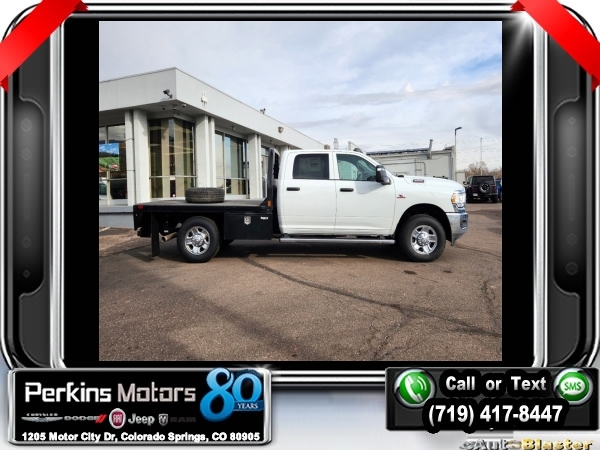 Factory MSRP: $73,175 Bright White Clearcoat 2024 Ram 3500 Tradesman 4WD Aisin 6-Speed Automatic Cummins 6.7L I6 Turbodiesel<br>CM FLATBED WITH 2 BOXES.<br>Check us out at www.perkinsmotors.com to see our specials! Since opening our doors in 1944, we’ve been proud to serve Colorado Springs, CO, and the surrounding areas of Pueblo, Castle Rock and Denver, CO. Throughout this time of being family owned for 80 years, we’ve maintained a firm commitment to our customers: to offer a wide selection of New Chrysler, Dodge, Fiat, Jeep, and Ram vehicles and quality pre-owned vehicles, and provide a quick, no-hassle car-buying process that ensures everyone drives off the lot satisfied with their purchase.<br><br>Chrome Appearance Group (Bright Front Bumper, Bright Wheel Skins, Center Hub, Chrome Grille Surround, Chrome Headlamp Bezels, and Matte Black Mesh Grille w/Chrome), Electrical Accessory Group (Voltage Monitoring Auto Idle Up System), Heavy Duty Snow Plow Prep Group, Quick Order Package 2YA Tradesman (Black Exterior Truck Badging, Black Key Fob, Door Sill Scuff Pads, Glove Box, Halogen Quad Headlamps, Map/Courtesy Lamp, Matte Black Grille Surround, Overhead Console, Overhead Cupholder Lamp, and Rear Dome Lamp), 102 mph Maximum Speed, 115V Auxiliary Power Outlet, 3.73 Axle Ratio, 4-Wheel Disc Brakes, 40/20/40 Split Bench Seat, 400W Inverter, 4G LTE Wi-Fi Hot Spot, 6 Speakers, 8.4 Touchscreen Display, ABS brakes, Air Conditioning, All R1 Low Radios, All Radio-Equipped Vehicles, Apple CarPlay, Bluetooth Handsfree Phone & Audio, Compass, Connectivity - US/Canada, Cruise Control, Delay-off headlights, Driver door bin, Dual front impact airbags, Electric Shift-On-The-Fly Transfer Case, Electronic Stability Control, For Details, Visit DriveUconnect.com, For More Info, Call 800-643-2112, Front anti-roll bar, Front Bucket Seats, Front Fog Lamps, Front License Plate Bracket, Fully automatic headlights, Global Telematics Box Module (TBM), Google Android Auto, GPS Antenna Input, HD Vinyl 40/20/40 Split Bench Seat, Heated door mirrors, Integrated Center Stack Radio, Integrated Voice Command w/Bluetooth, Manual Adjust 4-Way Driver Seat, Manual Adjust 4-Way Front Passenger Seat, Manual DPF Regeneration, Manufacturer's Statement of Origin, MOPAR Front & Rear Rubber Floor Mats, Occupant sensing airbag, Outside temperature display, Overhead console, ParkView Rear Back-Up Camera, Passenger door bin, Passenger vanity mirror, Power 2-Way Driver Lumbar Adjust, Power door mirrors, Power steering, Power windows, Radio data system, Radio: Uconnect 3 w/5 Display, Radio: Uconnect 5 w/8.4 Display, Rear anti-roll bar, Rear Backup Alarm, Rear Folding Seat, Rear Sliding Window, Remote Keyless Entry, Remote USB Port - Charge Only, SiriusXM Radio Service, SiriusXM Satellite Radio, Storage Tray, Tachometer, Temperature & Compass Gauge, Tilt steering wheel, Tow Hooks, Traction control, Trailer Brake Control, Trailer Light Check, Tubular Side Steps, Turn signal indicator mirrors, Variably intermittent wipers, Voltmeter, Wheels: 18 x 8.0 Steel, and Wheels: 18 x 8 Steel Chrome ClaD. Price includes $9,995 in dealer added accessories.