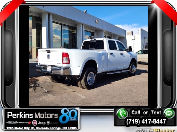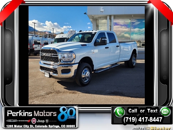 Factory MSRP: $77,610 $4,427 off MSRP! Bright White Clearcoat 2024 Ram 3500 Tradesman 4WD Aisin 6-Speed Automatic I6<br><br>Check us out at www.perkinsmotors.com to see our specials! Since opening our doors in 1944, we’ve been proud to serve Colorado Springs, CO, and the surrounding areas of Pueblo, Castle Rock and Denver, CO. Throughout this time of being family owned for 80 years, we’ve maintained a firm commitment to our customers: to offer a wide selection of New Chrysler, Dodge, Fiat, Jeep, and Ram vehicles and quality pre-owned vehicles, and provide a quick, no-hassle car-buying process that ensures everyone drives off the lot satisfied with their purchase.<br><br>Bed Utility Group (LED Bed Lighting, MOPAR Deployable Bed Step, and MOPAR Spray In Bedliner), Chrome Appearance Group (Bright Front Bumper, Bright Rear Bumper, Center Hub, Chrome Grille Surround, and Matte Black Mesh w/Chrome Grille), Cold Weather Group (Engine Block Heater and MOPAR Winter Front Grille Cover), Heavy Duty Snow Plow Prep Group (220 Amp Alternator), Protection Group, Quick Order Package 21A Tradesman, Tradesman Level 2 Equipment Group (2 Way Rear Headrest Seat, 4 Way Front Headrests, 40/20/40 Split Bench Seat, Black Exterior Mirrors, Carpet Floor Covering, Cloth 40/20/40 Bench Seat, Exterior Mirrors Courtesy Lamps, Exterior Mirrors w/Heating Element, Exterior Mirrors w/Supplemental Signals, Front & Rear Floor Mats, Front Armrest w/Cupholders, Manual Adjust 4-Way Driver Seat, Manual Adjust 4-Way Front Passenger Seat, Manual Folding Exterior Mirrors, Manual Telescoping Mirrors, Mirror Running Lights, Power Adjust Mirrors, Power Heat Fold Telescopic Mirrors, Power-Adjustable Convex Aux Mirrors, Rear Folding Seat, Rear Window Defroster, Remote USB Port - Charge Only, and Storage Tray), 3.73 Axle Ratio, 4-Wheel Disc Brakes, 4.10 Axle Ratio, 50 Gallon Fuel Tank, 5th Wheel/Gooseneck Towing Prep Group, 6 Speakers, 6000# Front Axle w/Hub Ext, ABS brakes, Active Noise Control System, Air Conditioning, AM/FM radio, Auto Level Rear Air Suspension, Auto Power-Folding Mirrors, Box & Rear Fender Clearance Lamps, Brake assist, Chrome Flat Cab-Length Side Steps, Clearance Lamps, Compass, Cruise Control, CTR Stop Lamp w/Cargo View Camera, Dash Pass Thru Wire Circuits, Delay-off headlights, Driver door bin, Dual front impact airbags, Dual front side impact airbags, Dual Rear Wheels, Electric Shift-On-The-Fly Transfer Case, Electronic Stability Control, Electronically Controlled Throttle, Emergency communication system: SiriusXM Guardian, For Details Visit DriveUconnect.com, Forward & Reverse Utility Lights, Front anti-roll bar, Front Center Armrest w/Storage, Front License Plate Bracket, Front reading lights, Fully automatic headlights, Global Telematics Box Module (TBM), GPS Antenna Input, HD Vinyl 40/20/40 Split Bench Seat, I/P Mounted Auxiliary Switches, Illuminated entry, Integrated Center Stack Radio, Integrated Voice Command w/Bluetooth, Low tire pressure warning, Manufacturer's Statement of Origin, MOPAR Front & Rear Rubber Floor Mats, Occupant sensing airbag, Outside temperature display, Overhead airbag, Overhead console, ParkView Rear Back-Up Camera, Passenger door bin, Passenger vanity mirror, Power Heated Fold Telescopic Mirrors, Power steering, Power Telescoping Mirrors, Power windows, Radio data system, Radio: Uconnect 3 w/5 Display, Radio: Uconnect 5 w/8.4 Display, Rear step bumper, Rear Wheelhouse Liners, SiriusXM Radio Service, Tachometer, Tilt steering wheel, Tip Start, Traction control, Trailer Brake Control, Trailer Light Check, Variably intermittent wipers, Voltmeter, Wheels: 17 x 6.0 Steel Argent, Wheels: 17 x 6.0 Steel Chrome Clad, and Wheels: 18 x 8.0 SteeL.