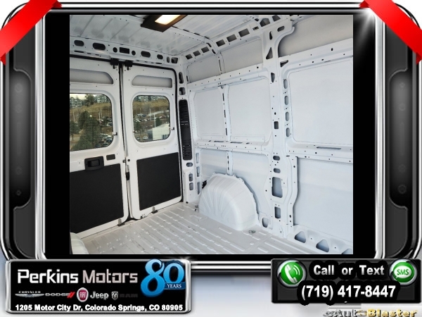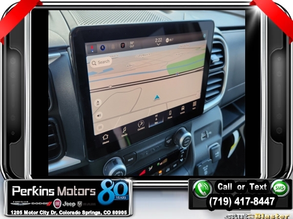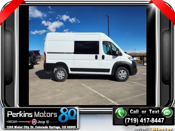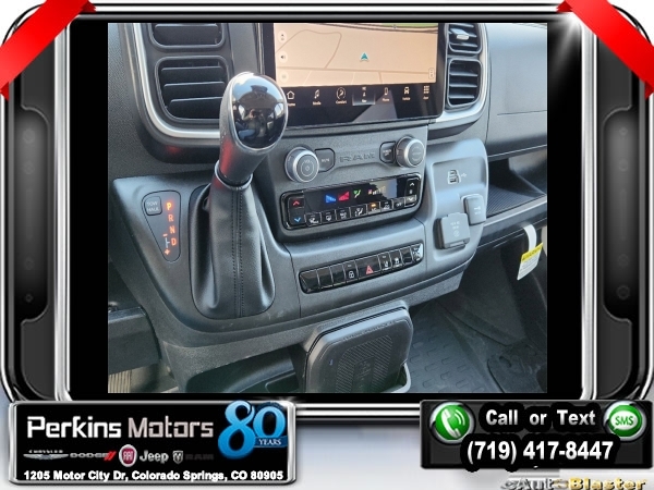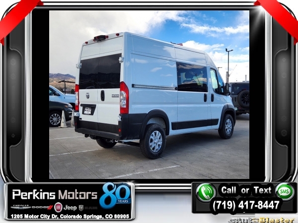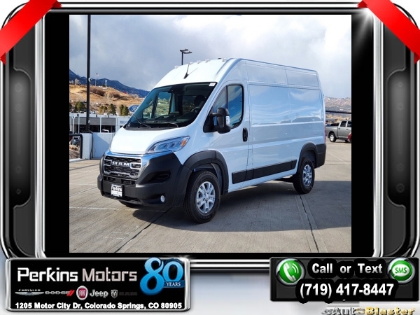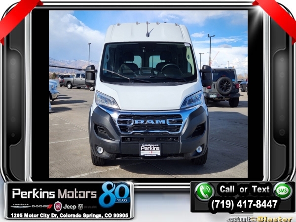 Factory MSRP: $60,825 $4,477 off MSRP! Bright White Clearcoat 2024 Ram ProMaster 1500 FWD 9-Speed 948TE Automatic 3.6L V6 24V VVT<br><br>Check us out at www.perkinsmotors.com to see our specials! Since opening our doors in 1944, we’ve been proud to serve Colorado Springs, CO, and the surrounding areas of Pueblo, Castle Rock and Denver, CO. Throughout this time of being family owned for 80 years, we’ve maintained a firm commitment to our customers: to offer a wide selection of New Chrysler, Dodge, Fiat, Jeep, and Ram vehicles and quality pre-owned vehicles, and provide a quick, no-hassle car-buying process that ensures everyone drives off the lot satisfied with their purchase.<br><br>Leather Interior Group (6-Way Manual Adjust Driver Seat, Black/Gray Seats, Driver Seat Armrest, Driver Swivel Seat, Leather Trimmed Bucket Seats, Leather Wrapped Steering Wheel, Manual 2-Way Driver Lumbar Adjust, Manual 2-Way Passenger Lumbar Adjust, Passenger Bucket Seat, Passenger Seat Armrest, and Passenger Swivel Seat), Quick Order Package 22H SLT+ (100 Amp Battery, 115V Auxiliary Power Outlet, 12V Rear Auxiliary Power Outlet, 220 Amp Alternator, 6-Way Manual Adjust Front Passenger Seat, Auto High Beam Headlamp Control, Automatic Headlamps, Blind Spot & Cross Path Detection, Connected Travel & Traffic Services, Cowl Aesthetic Cover, Digital Rearview Mirror w/Autodim, Exterior Mirrors w/Heating Element, Front LED Fog Lamps, GPS Navigation, HD Radio, Instrument Panel Bright Bezels, Intelligent Speed Assist (ISA), Lane Departure Warning Plus, LED Daytime Running Headlamps, LED Reflector Headlamps, ParkSense Front/Rear Park Assist System, Passive Entry, Power Adjust Mirrors, Power Folding/Heated Mirrors, Power-Adjustable Convex Aux Mirrors, Radio: Uconnect 5 Nav w/10.1 Display, Rain Sensitive Windshield Wipers, Remote Start System, Security Alarm, SiriusXM w/360L, Traffic Sign Information, Wheels: 16 x 6.0 Aluminum Painted Silver, and Wireless Charging Pad), Rear Heater - A/C Prep Package, 4 Speakers, 4-Wheel Disc Brakes, 4.08 Axle Ratio, ABS brakes, Air Conditioning, AM/FM radio: SiriusXM, Apple CarPlay/Android Auto, Black Seats, Bodyside moldings, Brake assist, Class IV Receiver Hitch, Cloth Bucket Seats, Deep Tint Sunscreen Glass, Driver door bin, Driver's Seat Mounted Armrest, Electronic Stability Control, Exterior Mirrors w/Supplemental Signals, Front anti-roll bar, Front Bucket Seats, Front License Plate Bracket, Front reading lights, Front wheel independent suspension, Illuminated entry, Low tire pressure warning, Manufacturer's Statement of Origin, Medium Duty Suspension, Outside temperature display, Overhead airbag, Overhead console, ParkView Rear Back-Up Camera, Passenger door bin, Passenger Sliding Door w/Window (Polycarb), Polycarbonate Window Material, Power steering, Power windows, Radio: Uconnect 5 w/7 Display, Rear Hinged Doors w/Fixed Glass, Rear View Day/Night Mirror, Rear Window Defroster, Remote keyless entry, Steering wheel mounted audio controls, Tachometer, Telescoping steering wheel, Traction control, Trip computer, Turn signal indicator mirrors, Variably intermittent wipers, Wheel Center Cap, and Wheels: 16 x 6.0 Steel.