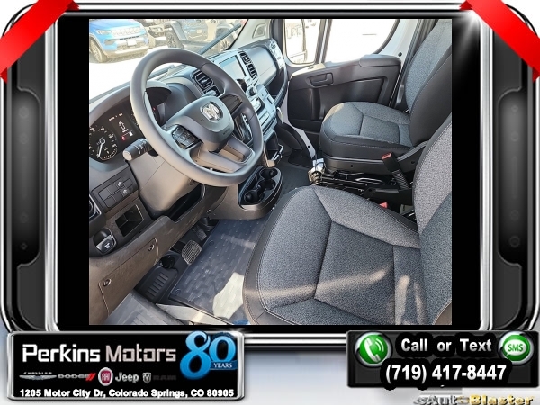 Factory MSRP: $53,705 $2,213 off MSRP! Priced below KBB Fair Purchase Price! Bright White Clearcoat 2024 Ram ProMaster 2500 High Roof FWD 9-Speed 948TE Automatic 3.6L V6 24V VVT<br><br>Check us out at www.perkinsmotors.com to see our specials! Since opening our doors in 1944, we’ve been proud to serve Colorado Springs, CO, and the surrounding areas of Pueblo, Castle Rock and Denver, CO. Throughout this time of being family owned for 80 years, we’ve maintained a firm commitment to our customers: to offer a wide selection of New Chrysler, Dodge, Fiat, Jeep, and Ram vehicles and quality pre-owned vehicles, and provide a quick, no-hassle car-buying process that ensures everyone drives off the lot satisfied with their purchase.<br><br>Quick Order Package 22B Tradesman w/Pass Seat (4-Way Manual Adjust Front Passenger Seat and Passenger Bucket Seat), 4 Speakers, 4-Wheel Disc Brakes, 4.08 Axle Ratio, ABS brakes, Air Conditioning, AM/FM radio: SiriusXM, Apple CarPlay/Android Auto, Black/Gray Seats, Bodyside moldings, Brake assist, Cloth Bucket Seats, Driver door bin, Driver Seat Armrest, Driver's Seat Mounted Armrest, Electronic Stability Control, Exterior Mirrors w/Supplemental Signals, Front anti-roll bar, Front Bucket Seats, Front License Plate Bracket, Front reading lights, Front wheel independent suspension, Heavy Duty Suspension, Illuminated entry, Low tire pressure warning, Manufacturer's Statement of Origin, MOPAR Cargo Area LED Lighting, Outside temperature display, Overhead airbag, Overhead console, ParkView Rear Back-Up Camera, Passenger door bin, Power steering, Power windows, Radio: Uconnect 5 w/7 Display, Remote keyless entry, Steering wheel mounted audio controls, Tachometer, Telescoping steering wheel, Traction control, Trip computer, Turn signal indicator mirrors, Variably intermittent wipers, Wheel Center Cap, and Wheels: 16 x 6.0 Steel.