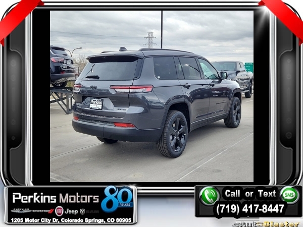 Factory MSRP: $63,330 $6,989 off MSRP! Baltic Gray Metallic Clearcoat 2024 Jeep Grand Cherokee L Limited 4WD 8-Speed Automatic 3.6L V6 24V VVT<br><br>Check us out at www.perkinsmotors.com to see our specials! Since opening our doors in 1944, we’ve been proud to serve Colorado Springs, CO, and the surrounding areas of Pueblo, Castle Rock and Denver, CO. Throughout this time of being family owned for 80 years, we’ve maintained a firm commitment to our customers: to offer a wide selection of New Chrysler, Dodge, Fiat, Jeep, and Ram vehicles and quality pre-owned vehicles, and provide a quick, no-hassle car-buying process that ensures everyone drives off the lot satisfied with their purchase.<br><br>Black Appearance Package (Gloss Black Exterior Accents and Wheels: 20 x 8.5 Gloss Black Painted Aluminum), Luxury Tech Group II (2nd Row Manual Window Shades, Auto-Dimming Exterior Driver Mirror, Capri Leatherette w/Axis II Seats, Integrated Off-Road Camera, Intersection Collision Assist System, Memory Steering Column, ParkSense Front/Rear Park Assist w/Stop, Passive Entry - Front/Rear Doors, Liftgate, Power Tilt/Telescope Steering Column, Rain Sensitive Windshield Wipers, Rear Back Up Camera Washer, Rearview Autodim Digital Display Mirror, Surround View Camera System, Ventilated Front Seats, and Wireless Charging Pad), Quick Order Package 23E, Trailer Tow Package (220 Amp Alternator, 7 & 4 Pin Wiring Harness, Automatic Headlamp Leveling System, Class IV Receiver Hitch, Dual Exhaust Tips, Heavy-Duty Engine Cooling, Rear Load Leveling Suspension, and Trailer Hitch Zoom), 3.45 Rear Axle Ratio, 3rd row seats: split-bench, 4-Wheel Disc Brakes, 506 Watt Amplifier, 6 Speakers, 9 Amplified Speakers w/Subwoofer, ABS brakes, Active Noise Control System, Air Conditioning, Alloy wheels, AM/FM radio: SiriusXM with 360L, Anti-whiplash front head restraints, Audio memory, Auto High-beam Headlights, Automatic temperature control, Brake assist, Bumpers: body-color, Compass, Cruise Control, Delay-off headlights, Driver door bin, Driver vanity mirror, Dual front impact airbags, Dual front side impact airbags, Dual-Pane Panoramic Sunroof, Electronic Stability Control, Emergency communication system, Four wheel independent suspension, Front anti-roll bar, Front Bucket Seats, Front Center Armrest w/Storage, Front dual zone A/C, Front fog lights, Front License Plate Bracket, Front reading lights, Fully automatic headlights, Garage door transmitter, Heated door mirrors, Heated front seats, Heated rear seats, Heated steering wheel, Illuminated entry, Interior Rear Facing Camera, Knee airbag, Low tire pressure warning, Manual Fold Seatbacks, Memory seat, Navigation System, Normal Duty Suspension, Occupant sensing airbag, Outside temperature display, Overhead airbag, Overhead console, Panic alarm, ParkView Rear Back-Up Camera, Passenger door bin, Passenger vanity mirror, Power door mirrors, Power driver seat, Power Liftgate, Power passenger seat, Power steering, Power windows, Radio data system, Radio: Uconnect 5 Nav w/10.1 Display, Rear air conditioning, Rear anti-roll bar, Rear reading lights, Rear window defroster, Rear window wiper, Reclining 3rd row seat, Remote keyless entry, Roof rack: rails only, Security system, Speed-Sensitive Wipers, Split folding rear seat, Spoiler, Steering wheel mounted audio controls, Tachometer, Telescoping steering wheel, Tilt steering wheel, Traction control, Trip computer, Turn signal indicator mirrors, Variably intermittent wipers, Vinyl Seats, Voltmeter, and Wheels: 18 x 8.0 Polished/Painted Aluminum. Sale price includes all manufacture's incentives and dealer discounts. Sale price not available on lease or compatible with special APR. $1000 - 2024 JEEP Retail Bonus Cash 24CRA1. Exp. 01/02/2025 $1000 - 2024 JR Denver BC Bonus Cash DECRA. Exp. 06/03/2024 $1500 - 2024 JEEP Denver BC Retail Consumer Cash 74CR1. Exp. 06/03/2024