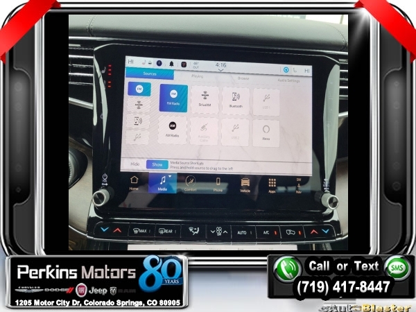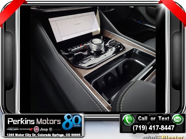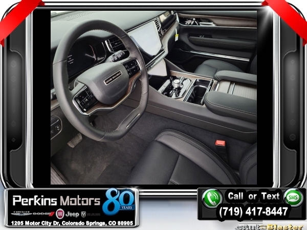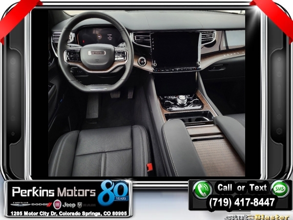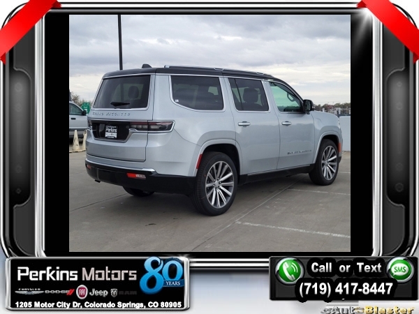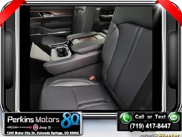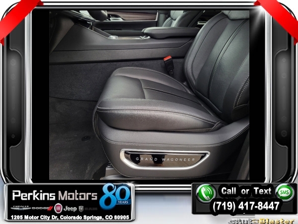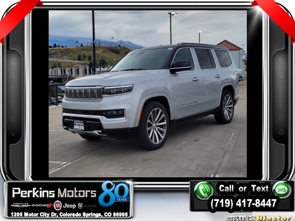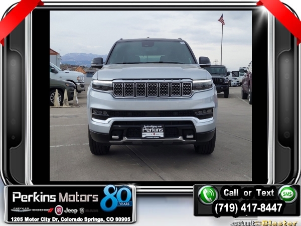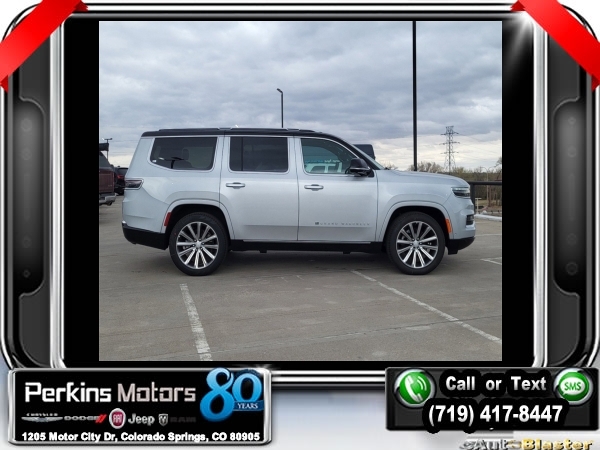 Factory MSRP: $101,700 $8,508 off MSRP! Silver Zynith 2024 Jeep Grand Wagoneer 4WD 8-Speed Automatic 3.0L I6<br><br>Check us out at www.perkinsmotors.com to see our specials! Since opening our doors in 1944, we’ve been proud to serve Colorado Springs, CO, and the surrounding areas of Pueblo, Castle Rock and Denver, CO. Throughout this time of being family owned for 80 years, we’ve maintained a firm commitment to our customers: to offer a wide selection of New Chrysler, Dodge, Fiat, Jeep, and Ram vehicles and quality pre-owned vehicles, and provide a quick, no-hassle car-buying process that ensures everyone drives off the lot satisfied with their purchase.<br><br>HD Trailer Tow Package (Chrome Tow Hooks, Heavy-Duty Engine Cooling, Locking In-Vehicle Safe, Removable Rear Tow Hook, Trailer Brake Control, and Trailer Hitch Zoom), Quick Order Package 28S, Two Tone Paint Group, 19 Speakers, 3.92 Rear Axle Ratio, 3rd row seats: bench, 4-Wheel Disc Brakes, ABS brakes, Adaptive suspension, Adjustable pedals, Air Conditioning, Alloy wheels, AM/FM radio: SiriusXM with 360L, Anti-whiplash front head restraints, Apple CarPlay/Android Auto, Audio memory, Auto High-beam Headlights, Auto-dimming door mirrors, Auto-dimming Rear-View mirror, Auto-leveling suspension, Automatic temperature control, Brake assist, Bumpers: body-color, Compass, Cruise Control, Delay-off headlights, Driver door bin, Driver vanity mirror, Driver's Seat Mounted Armrest, Dual front impact airbags, Dual front side impact airbags, Electronic Stability Control, Emergency communication system: Wagoneer Connect, Four wheel independent suspension, Front anti-roll bar, Front Bucket Seats, Front Center Armrest w/Storage, Front dual zone A/C, Front fog lights, Front Passenger Interactive Display, Front reading lights, Fully automatic headlights, Garage door transmitter, Genuine wood console insert, Genuine wood dashboard insert, Genuine wood door panel insert, Heads-Up Display, Heated door mirrors, Heated front seats, Heated rear seats, Heated steering wheel, Illuminated entry, Knee airbag, Leather steering wheel, Leather Trimmed Bucket Seats, Low tire pressure warning, Memory seat, Navigation System, Normal Duty Suspension, Occupant sensing airbag, Outside temperature display, Overhead airbag, Overhead console, Panic alarm, Passenger door bin, Passenger seat mounted armrest, Passenger vanity mirror, Pedal memory, Power adjustable front head restraints, Power door mirrors, Power driver seat, Power Liftgate, Power moonroof, Power passenger seat, Power steering, Power windows, Radio data system, Radio: Uconnect 5 Nav w/12.0 Display, Rain sensing wipers, Rear air conditioning, Rear anti-roll bar, Rear dual zone A/C, Rear reading lights, Rear seat center armrest, Rear window defroster, Rear window wiper, Reclining 3rd row seat, Remote keyless entry, Roof rack: rails only, Security system, Speed-sensing steering, Speed-Sensitive Wipers, Split folding rear seat, Steering wheel memory, Steering wheel mounted audio controls, Tachometer, Telescoping steering wheel, Tilt steering wheel, Traction control, Trip computer, Turn signal indicator mirrors, Variably intermittent wipers, Ventilated front seats, Voltmeter, Wheels: 20 x 9.0 Premium 3 Aluminum, and Wheels: 22 x 9.0 Premium 1 Aluminum.