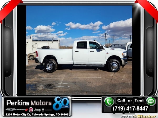 Factory MSRP: $77,610 $4,427 off MSRP! Bright White Clearcoat 2024 Ram 3500 Tradesman 4WD Aisin 6-Speed Automatic I6<br><br>Check us out at www.perkinsmotors.com to see our specials! Since opening our doors in 1944, we’ve been proud to serve Colorado Springs, CO, and the surrounding areas of Pueblo, Castle Rock and Denver, CO. Throughout this time of being family owned for 80 years, we’ve maintained a firm commitment to our customers: to offer a wide selection of New Chrysler, Dodge, Fiat, Jeep, and Ram vehicles and quality pre-owned vehicles, and provide a quick, no-hassle car-buying process that ensures everyone drives off the lot satisfied with their purchase.<br><br>Bed Utility Group (LED Bed Lighting, MOPAR Deployable Bed Step, and MOPAR Spray In Bedliner), Chrome Appearance Group (Bright Front Bumper, Bright Rear Bumper, Center Hub, Chrome Grille Surround, and Matte Black Mesh w/Chrome Grille), Cold Weather Group (Engine Block Heater and MOPAR Winter Front Grille Cover), Heavy Duty Snow Plow Prep Group (220 Amp Alternator), Protection Group, Quick Order Package 21A Tradesman, Tradesman Level 2 Equipment Group (2 Way Rear Headrest Seat, 4 Way Front Headrests, 40/20/40 Split Bench Seat, Black Exterior Mirrors, Carpet Floor Covering, Cloth 40/20/40 Bench Seat, Exterior Mirrors Courtesy Lamps, Exterior Mirrors w/Heating Element, Exterior Mirrors w/Supplemental Signals, Front & Rear Floor Mats, Front Armrest w/Cupholders, Manual Adjust 4-Way Driver Seat, Manual Adjust 4-Way Front Passenger Seat, Manual Folding Exterior Mirrors, Manual Telescoping Mirrors, Mirror Running Lights, Power Adjust Mirrors, Power Heat Fold Telescopic Mirrors, Power-Adjustable Convex Aux Mirrors, Rear Folding Seat, Rear Window Defroster, Remote USB Port - Charge Only, and Storage Tray), 3.73 Axle Ratio, 4-Wheel Disc Brakes, 4.10 Axle Ratio, 50 Gallon Fuel Tank, 5th Wheel/Gooseneck Towing Prep Group, 6 Speakers, 6000# Front Axle w/Hub Ext, ABS brakes, Active Noise Control System, Air Conditioning, AM/FM radio, Auto Level Rear Air Suspension, Auto Power-Folding Mirrors, Box & Rear Fender Clearance Lamps, Brake assist, Chrome Flat Cab-Length Side Steps, Clearance Lamps, Compass, Cruise Control, CTR Stop Lamp w/Cargo View Camera, Dash Pass Thru Wire Circuits, Delay-off headlights, Driver door bin, Dual front impact airbags, Dual front side impact airbags, Dual Rear Wheels, Electric Shift-On-The-Fly Transfer Case, Electronic Stability Control, Electronically Controlled Throttle, Emergency communication system: SiriusXM Guardian, For Details Visit DriveUconnect.com, Forward & Reverse Utility Lights, Front anti-roll bar, Front Center Armrest w/Storage, Front License Plate Bracket, Front reading lights, Fully automatic headlights, Global Telematics Box Module (TBM), GPS Antenna Input, HD Vinyl 40/20/40 Split Bench Seat, I/P Mounted Auxiliary Switches, Illuminated entry, Integrated Center Stack Radio, Integrated Voice Command w/Bluetooth, Low tire pressure warning, Manufacturer's Statement of Origin, MOPAR Front & Rear Rubber Floor Mats, Occupant sensing airbag, Outside temperature display, Overhead airbag, Overhead console, ParkView Rear Back-Up Camera, Passenger door bin, Passenger vanity mirror, Power Heated Fold Telescopic Mirrors, Power steering, Power Telescoping Mirrors, Power windows, Radio data system, Radio: Uconnect 3 w/5 Display, Radio: Uconnect 5 w/8.4 Display, Rear step bumper, Rear Wheelhouse Liners, SiriusXM Radio Service, Tachometer, Tilt steering wheel, Tip Start, Traction control, Trailer Brake Control, Trailer Light Check, Variably intermittent wipers, Voltmeter, Wheels: 17 x 6.0 Steel Argent, Wheels: 17 x 6.0 Steel Chrome Clad, and Wheels: 18 x 8.0 SteeL.