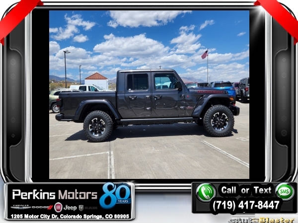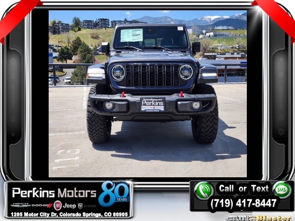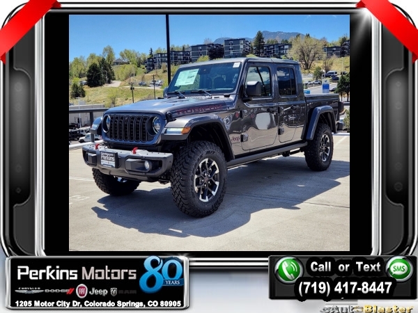 Factory MSRP: $70,365 $6,672 off MSRP! Priced below KBB Fair Purchase Price! Granite Crystal Metallic Clearcoat 2024 Jeep Gladiator Rubicon 4WD 8-Speed Automatic 3.6L V6 24V VVT<br><br>Check us out at www.perkinsmotors.com to see our specials! Since opening our doors in 1944, we’ve been proud to serve Colorado Springs, CO, and the surrounding areas of Pueblo, Castle Rock and Denver, CO. Throughout this time of being family owned for 80 years, we’ve maintained a firm commitment to our customers: to offer a wide selection of New Chrysler, Dodge, Fiat, Jeep, and Ram vehicles and quality pre-owned vehicles, and provide a quick, no-hassle car-buying process that ensures everyone drives off the lot satisfied with their purchase.<br><br>Quick Order Package 24Y Rubicon X (4G LTE Wi-Fi Hot Spot, Blind Spot & Cross Path Detection, Body Color 3-Piece Hard Top, Connectivity - US/Canada, HD Radio, Integrated Center Stack Radio, Integrated Off-Road Camera, No Soft Top, ParkSense Rear Park Assist System, Radio: Uconnect 5 Nav w/12.3 Display, Rear Sliding Window, SiriusXM Radio Service, and SiriusXM w/360L), 12.3 Touchscreen Display, 4-Wheel Disc Brakes, 4.10 Rear Axle Ratio, 8 Speakers, 97 MPH Vehicle Max Speed Calibration, ABS brakes, Air Conditioning, Alexa Built-In, Alloy wheels, AM/FM radio: SiriusXM with 360L, Apple CarPlay, Apple CarPlay/Android Auto, Automatic temperature control, Brake assist, Cloth Low-Back Bucket Seats, Compass, Cruise Control, Delay-off headlights, Driver door bin, Driver vanity mirror, Dual front impact airbags, Dual front side impact airbags, Electronic Stability Control, Emergency communication system: Jeep Connect, For Details, Visit DriveUconnect.com, For More Info, Call 800-643-2112, Front anti-roll bar, Front Bucket Seats, Front Center Armrest w/Storage, Front dual zone A/C, Front fog lights, Front License Plate Bracket, Front reading lights, Fully automatic headlights, Google Android Auto, Heated door mirrors, Illuminated entry, Integrated roll-over protection, Low tire pressure warning, Manufacturer's Statement of Origin, MOPAR All-Weather Slush Mats, MOPAR Spray In Bedliner, Occupant sensing airbag, Outside temperature display, Overhead airbag, Panic alarm, Passenger door bin, Passenger vanity mirror, Performance Suspension, Power door mirrors, Power steering, Power windows, Radio data system, Radio: Uconnect 5 w/12.3 Display, Rear anti-roll bar, Rear reading lights, Remote keyless entry, Security system, Split folding rear seat, Steering wheel mounted audio controls, Tachometer, Telescoping steering wheel, Tilt steering wheel, Traction control, Trip computer, Variably intermittent wipers, Voltmeter, Wheels: 17 x 7.5 Machined w/Black Pockets, and Wheels: 17 x 7.5 Machined/Painted BlacK. Sale price includes all manufacture's incentives and dealer discounts. Sale price not available on lease or compatible with special APR. $2000 - 2024 CJR Bonus Cash 24CRA. Exp. 06/03/2024