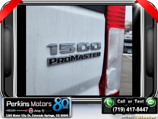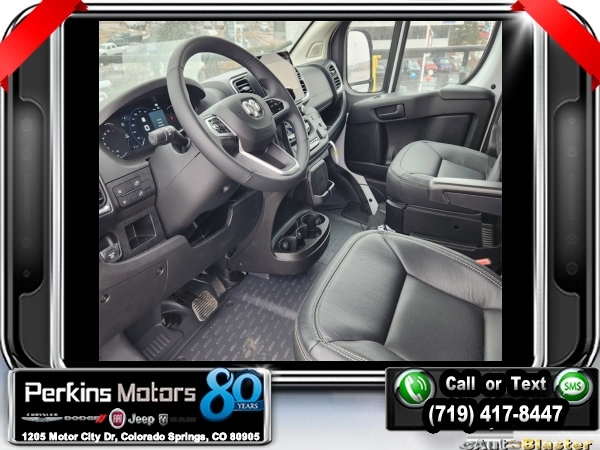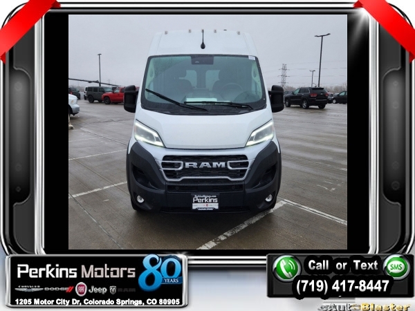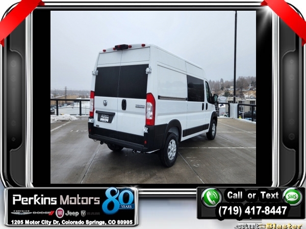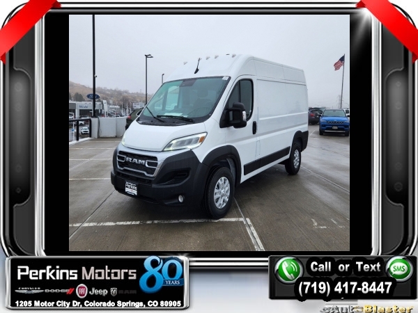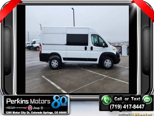Factory MSRP: $60,825 $4,477 off MSRP! Bright White Clearcoat 2024 Ram ProMaster 1500 FWD 9-Speed 948TE Automatic 3.6L V6 24V VVT<br><br>Check us out at www.perkinsmotors.com to see our specials! Since opening our doors in 1944, we’ve been proud to serve Colorado Springs, CO, and the surrounding areas of Pueblo, Castle Rock and Denver, CO. Throughout this time of being family owned for 80 years, we’ve maintained a firm commitment to our customers: to offer a wide selection of New Chrysler, Dodge, Fiat, Jeep, and Ram vehicles and quality pre-owned vehicles, and provide a quick, no-hassle car-buying process that ensures everyone drives off the lot satisfied with their purchase.<br><br>Leather Interior Group (6-Way Manual Adjust Driver Seat, Black/Gray Seats, Driver Seat Armrest, Driver Swivel Seat, Leather Trimmed Bucket Seats, Leather Wrapped Steering Wheel, Manual 2-Way Driver Lumbar Adjust, Manual 2-Way Passenger Lumbar Adjust, Passenger Bucket Seat, Passenger Seat Armrest, and Passenger Swivel Seat), Quick Order Package 22H SLT+ (100 Amp Battery, 115V Auxiliary Power Outlet, 12V Rear Auxiliary Power Outlet, 220 Amp Alternator, 6-Way Manual Adjust Front Passenger Seat, Auto High Beam Headlamp Control, Automatic Headlamps, Blind Spot & Cross Path Detection, Connected Travel & Traffic Services, Cowl Aesthetic Cover, Digital Rearview Mirror w/Autodim, Exterior Mirrors w/Heating Element, Front LED Fog Lamps, GPS Navigation, HD Radio, Instrument Panel Bright Bezels, Intelligent Speed Assist (ISA), Lane Departure Warning Plus, LED Daytime Running Headlamps, LED Reflector Headlamps, ParkSense Front/Rear Park Assist System, Passive Entry, Power Adjust Mirrors, Power Folding/Heated Mirrors, Power-Adjustable Convex Aux Mirrors, Radio: Uconnect 5 Nav w/10.1 Display, Rain Sensitive Windshield Wipers, Remote Start System, Security Alarm, SiriusXM w/360L, Traffic Sign Information, Wheels: 16 x 6.0 Aluminum Painted Silver, and Wireless Charging Pad), Rear Heater - A/C Prep Package, 4 Speakers, 4-Wheel Disc Brakes, 4.08 Axle Ratio, ABS brakes, Air Conditioning, AM/FM radio: SiriusXM, Apple CarPlay/Android Auto, Black Seats, Bodyside moldings, Brake assist, Class IV Receiver Hitch, Cloth Bucket Seats, Deep Tint Sunscreen Glass, Driver door bin, Driver's Seat Mounted Armrest, Electronic Stability Control, Exterior Mirrors w/Supplemental Signals, Front anti-roll bar, Front Bucket Seats, Front License Plate Bracket, Front reading lights, Front wheel independent suspension, Illuminated entry, Low tire pressure warning, Manufacturer's Statement of Origin, Medium Duty Suspension, Outside temperature display, Overhead airbag, Overhead console, ParkView Rear Back-Up Camera, Passenger door bin, Passenger Sliding Door w/Window (Polycarb), Polycarbonate Window Material, Power steering, Power windows, Radio: Uconnect 5 w/7 Display, Rear Hinged Doors w/Fixed Glass, Rear View Day/Night Mirror, Rear Window Defroster, Remote keyless entry, Steering wheel mounted audio controls, Tachometer, Telescoping steering wheel, Traction control, Trip computer, Turn signal indicator mirrors, Variably intermittent wipers, Wheel Center Cap, and Wheels: 16 x 6.0 Steel.
