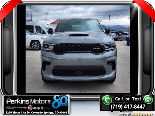 Factory MSRP: $61,450 $7,091 off MSRP! Priced below KBB Fair Purchase Price! Destroyer Gray Clearcoat 2024 Dodge Durango R/T AWD 8-Speed Automatic HEMI 5.7L V8 Multi Displacement VVT<br>AWD.<br>Check us out at www.perkinsmotors.com to see our specials! Since opening our doors in 1944, we’ve been proud to serve Colorado Springs, CO, and the surrounding areas of Pueblo, Castle Rock and Denver, CO. Throughout this time of being family owned for 80 years, we’ve maintained a firm commitment to our customers: to offer a wide selection of New Chrysler, Dodge, Fiat, Jeep, and Ram vehicles and quality pre-owned vehicles, and provide a quick, no-hassle car-buying process that ensures everyone drives off the lot satisfied with their purchase.<br><br>Blacktop Package (Black Roof Rails, Gloss Black Badges, Integrated Roof Rail Crossbars, and Satin Black Dodge Tail Lamp Badge), Quick Order Package 22T R/T Plus (115V Auxiliary Power Outlet, 7 & 4 Pin Wiring Harness, Adaptive Cruise Control w/Stop, Auto-Dimming Exterior Driver Mirror, Blind Spot w/Trailer Detection, Class IV Receiver Hitch, Dual Remote USB Port - Charge Only, Exterior Mirrors w/Heating Element, Exterior Mirrors w/Memory, Exterior Mirrors w/Supplemental Signals, Floor Console w/Leather Armrest, Full Speed Forward Collision Warning Plus, Gloss Black Exterior Mirrors, Heated Second Row Seats, Leather Trimmed Bucket Seats, Leather Wrapped Door Panels, LED Auxiliary Low Beam & Turn Signal, Power 6x9 Multi-Function Foldaway Mirrors, Power 8-Way Driver Memory 8-Way Passenger Seats, Power Driver/Passenger 4-Way Lumbar Adjust, Power Tilt & Telescopic Steering Column, Radio/Driver Seat/Mirrors Memory, Red Accent Stitching, Trailer Brake Control, and Ventilated Front Seats), AWD, 2nd Row Fold/Tumble Captain Chairs, 2nd Row Mini Console w/Cupholders, 2nd Row Seat Mounted Inboard Armrests, 3.09 Rear Axle Ratio, 3rd Row Floor Mat & Mini Console, 3rd row seats: split-bench, 4-Wheel Disc Brakes, 6-Passenger Seating, 9 Speakers, ABS brakes, Air Conditioning, Alloy wheels, AM/FM radio: SiriusXM w/360L, Anti-whiplash front head restraints, Apple CarPlay/Android Auto, Auto High-beam Headlights, Auto-dimming Rear-View mirror, Auto-leveling suspension, Automatic temperature control, Brake assist, Bumpers: body-color, Cloth Bucket Seats w/Shift Insert, Compass, Cruise Control, Delay-off headlights, Driver door bin, Driver vanity mirror, Dual front impact airbags, Dual front side impact airbags, Electronic Stability Control, Emergency communication system, Four wheel independent suspension, Front anti-roll bar, Front Bucket Seats, Front Center Armrest w/Storage, Front dual zone A/C, Front License Plate Bracket, Front reading lights, Fully automatic headlights, Garage door transmitter, Heated door mirrors, Heated front seats, Heated steering wheel, Illuminated entry, Knee airbag, Leather steering wheel, Low tire pressure warning, Navigation system: TomTom, Occupant sensing airbag, Outside temperature display, Overhead airbag, Overhead console, Panic alarm, ParkView Rear Back-Up Camera, Passenger door bin, Passenger vanity mirror, Power door mirrors, Power driver seat, Power Liftgate, Power steering, Power windows, Radio data system, Radio: Uconnect 5 Nav w/10.1 Display, Rain sensing wipers, Rear air conditioning, Rear anti-roll bar, Rear Load Leveling Suspension, Rear reading lights, Rear seat center armrest, Rear window defroster, Rear window wiper, Remote keyless entry, Security system, Speed-sensing steering, Speed-Sensitive Wipers, Split folding rear seat, Spoiler, Sport steering wheel, Steering wheel mounted audio controls, Tachometer, Telescoping steering wheel, Tilt steering wheel, Traction control, Trip computer, Variably intermittent wipers, Voltmeter, Wheels: 20 x 8.0 Black Noise Sale price includes all manufacture's incentives and dealer discounts. Sale price not available on lease or compatible with special APR. $3600 - 2024 DODGE National Power Dollars Bonus Cash 39CR1. Exp. 0