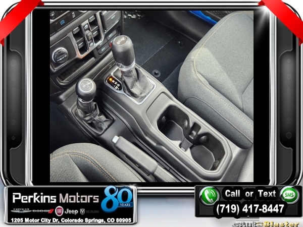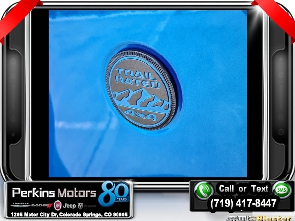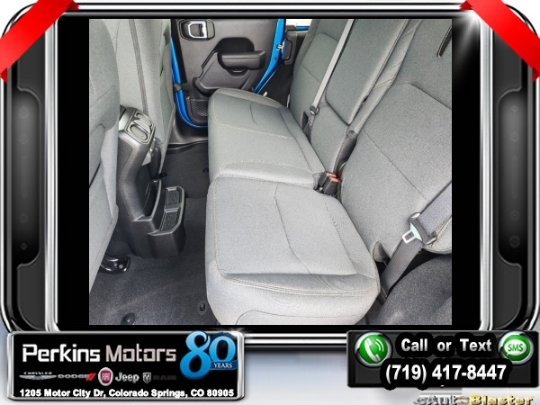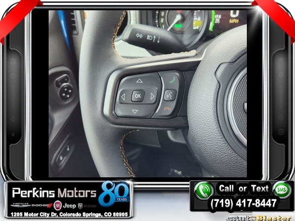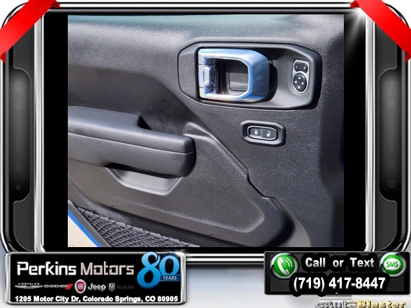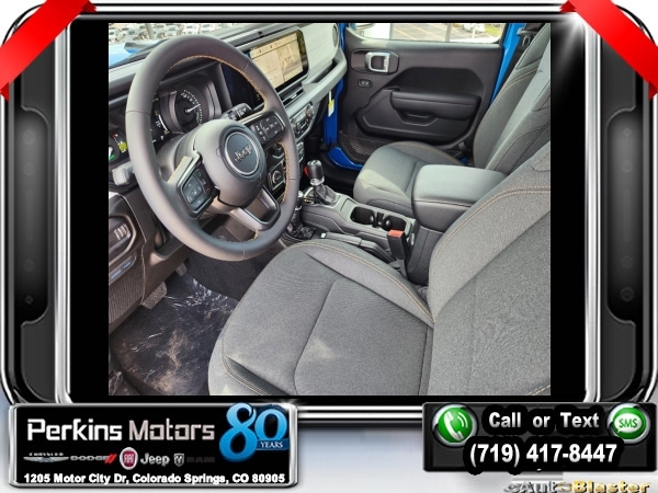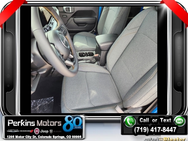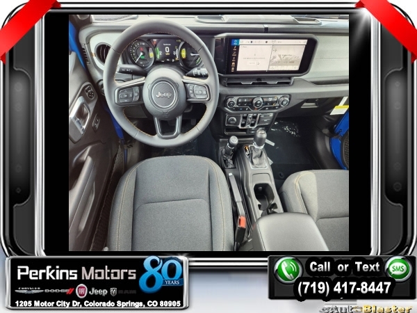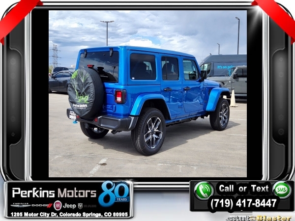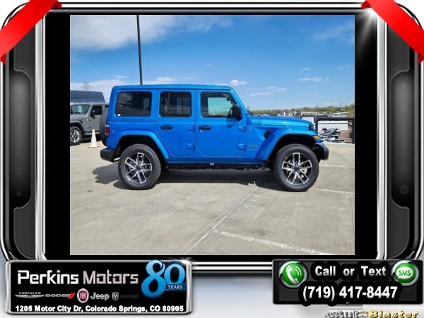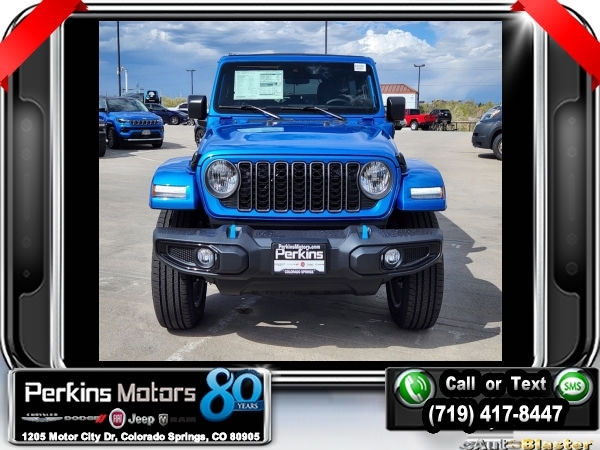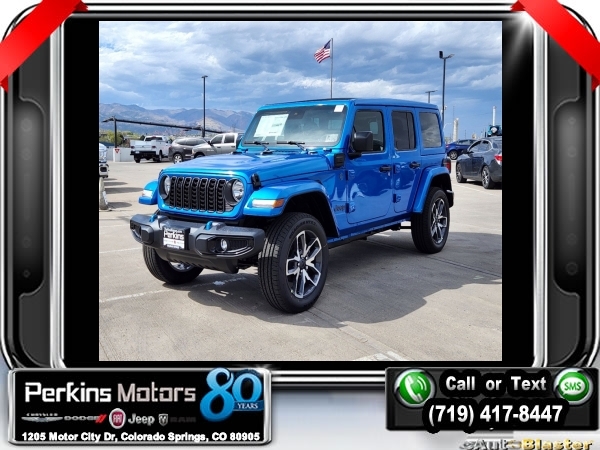 Factory MSRP: $60,540 $9,588 off MSRP! Hydro Blue Pearl Coat 2024 Jeep Wrangler Sport S 4xe 4WD 8-Speed Automatic 2.0L I4 DOHC<br>2.0L I4 DOHC.<br>Check us out at www.perkinsmotors.com to see our specials! Since opening our doors in 1944, we’ve been proud to serve Colorado Springs, CO, and the surrounding areas of Pueblo, Castle Rock and Denver, CO. Throughout this time of being family owned for 80 years, we’ve maintained a firm commitment to our customers: to offer a wide selection of New Chrysler, Dodge, Fiat, Jeep, and Ram vehicles and quality pre-owned vehicles, and provide a quick, no-hassle car-buying process that ensures everyone drives off the lot satisfied with their purchase.<br><br>Convenience Group (2-Door Passive Entry, Front Door Locks and Universal Garage Door Opener), Quick Order Package 29U Sport S, Trailer Tow & Aux Switch Group (Class II Receiver Hitch), 2.0L I4 DOHC, 3.73 Rear Axle Ratio, 4-Wheel Disc Brakes, 8 Speakers, ABS brakes, Air Conditioning, Alloy wheels, Apple CarPlay/Android Auto, Automatic temperature control, Brake assist, Cloth Low-Back Bucket Seats, Compass, Cruise Control, Delay-off headlights, Driver door bin, Driver vanity mirror, Dual front impact airbags, Dual front side impact airbags, Electronic Stability Control, Front anti-roll bar, Front Bucket Seats, Front Center Armrest w/Storage, Front dual zone A/C, Front fog lights, Front License Plate Bracket, Front reading lights, Fully automatic headlights, Heated door mirrors, Illuminated entry, Integrated roll-over protection, Low tire pressure warning, MOPAR All-Weather Floor Mats, Occupant sensing airbag, Outside temperature display, Overhead airbag, Panic alarm, ParkView Rear Back-Up Camera, Passenger door bin, Passenger vanity mirror, Power door mirrors, Power steering, Power windows, Radio data system, Radio: Uconnect 5 w/12.3 Display, Rear anti-roll bar, Rear reading lights, Remote keyless entry, Removable Rear Quarter Windows, Security system, Sky 1-Touch Power Top, Split folding rear seat, Sport Suspension, Steering wheel mounted audio controls, Tachometer, Telescoping steering wheel, Tilt steering wheel, Traction control, Trip computer, Variably intermittent wipers, Voltmeter, and Wheels: 20 x 8 Machined/Painted Gray. Sale price includes all manufacture's incentives and dealer discounts. Sale price not available on lease or compatible with special APR. $3000 - 2024 DJR National Retail Consumer Cash 24CR1. Exp. 06/03/2024 $3750 - Federal EV Tax Credit. Exp. 12/31/2024