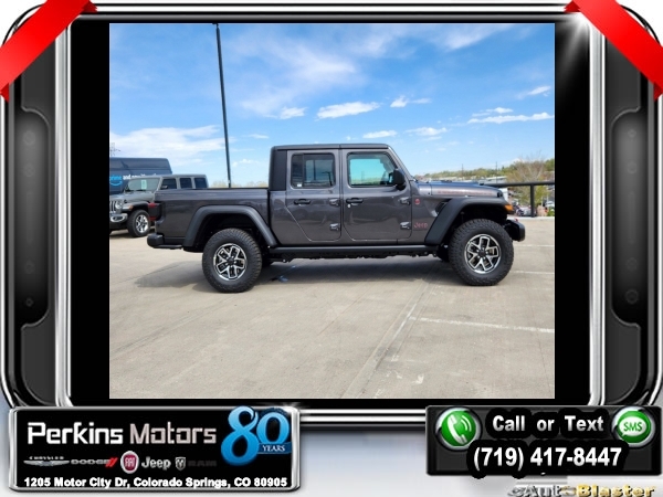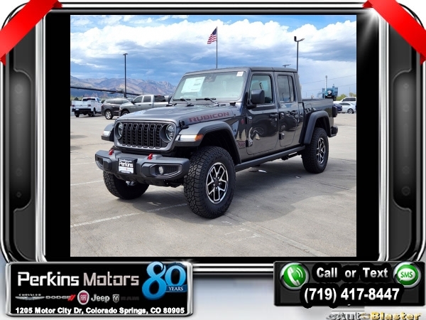 Factory MSRP: $61,450 $5,582 off MSRP! Priced below KBB Fair Purchase Price! Granite Crystal Metallic Clearcoat 2024 Jeep Gladiator Rubicon 4WD 8-Speed Automatic 3.6L V6 24V VVT<br><br>Check us out at www.perkinsmotors.com to see our specials! Since opening our doors in 1944, we’ve been proud to serve Colorado Springs, CO, and the surrounding areas of Pueblo, Castle Rock and Denver, CO. Throughout this time of being family owned for 80 years, we’ve maintained a firm commitment to our customers: to offer a wide selection of New Chrysler, Dodge, Fiat, Jeep, and Ram vehicles and quality pre-owned vehicles, and provide a quick, no-hassle car-buying process that ensures everyone drives off the lot satisfied with their purchase.<br><br>Convenience Group (For More Info, Call 800-643-2112, Remote Start System, SiriusXM Radio Service, and SiriusXM w/360L), Quick Order Package 24R Rubicon, 12.3 Touchscreen Display, 4-Wheel Disc Brakes, 4.10 Rear Axle Ratio, 4G LTE Wi-Fi Hot Spot, 8 Speakers, 97 MPH Vehicle Max Speed Calibration, ABS brakes, Air Conditioning, Alexa Built-In, Alloy wheels, AM/FM radio: SiriusXM with 360L, Apple CarPlay, Apple CarPlay/Android Auto, Automatic temperature control, Black 3-Piece Hard Top, Brake assist, Cloth Low-Back Bucket Seats, Compass, Connectivity - US/Canada, Cruise Control, Delay-off headlights, Driver door bin, Driver vanity mirror, Dual front impact airbags, Dual front side impact airbags, Electronic Stability Control, Emergency communication system: Jeep Connect, For Details, Visit DriveUconnect.com, Front anti-roll bar, Front Bucket Seats, Front Center Armrest w/Storage, Front dual zone A/C, Front fog lights, Front License Plate Bracket, Front reading lights, Fully automatic headlights, Google Android Auto, Heated door mirrors, Illuminated entry, Integrated Center Stack Radio, Integrated roll-over protection, Low tire pressure warning, Manufacturer's Statement of Origin, MOPAR All-Weather Slush Mats, MOPAR Spray In Bedliner, Occupant sensing airbag, Outside temperature display, Overhead airbag, Panic alarm, Passenger door bin, Passenger vanity mirror, Performance Suspension, Power door mirrors, Power steering, Power windows, Radio data system, Radio: Uconnect 5 w/12.3 Display, Rear anti-roll bar, Rear reading lights, Rear Sliding Window, Remote keyless entry, Security system, Split folding rear seat, Steering wheel mounted audio controls, Tachometer, Telescoping steering wheel, Tilt steering wheel, Traction control, Trip computer, Variably intermittent wipers, Voltmeter, and Wheels: 17 x 7.5 Machined/Painted BlacK. Sale price includes all manufacture's incentives and dealer discounts. Sale price not available on lease or compatible with special APR. $2000 - 2024 CJR Bonus Cash 24CRA. Exp. 06/03/2024
