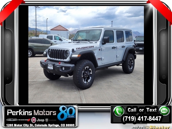 Factory MSRP: $66,730 $6,542 off MSRP! Silver Zynith Clearcoat 2024 Jeep Wrangler Rubicon 4WD 8-Speed Automatic 3.6L V6 24V VVT<br><br>Check us out at www.perkinsmotors.com to see our specials! Since opening our doors in 1944, we’ve been proud to serve Colorado Springs, CO, and the surrounding areas of Pueblo, Castle Rock and Denver, CO. Throughout this time of being family owned for 80 years, we’ve maintained a firm commitment to our customers: to offer a wide selection of New Chrysler, Dodge, Fiat, Jeep, and Ram vehicles and quality pre-owned vehicles, and provide a quick, no-hassle car-buying process that ensures everyone drives off the lot satisfied with their purchase.<br><br>Convenience Group (Remote Start System), Quick Order Package 24R Rubicon, 12.3 Touchscreen Display, 4-Wheel Disc Brakes, 4.10 Rear Axle Ratio, 8 Speakers, 97 MPH Vehicle Max Speed Calibration, ABS brakes, Air Conditioning, Alloy wheels, AM/FM radio: SiriusXM, Apple CarPlay, Apple CarPlay/Android Auto, Automatic temperature control, Aux Battery, Brake assist, Cloth Low-Back Bucket Seats, Compass, Connectivity - US/Canada, Cruise Control, Delay-off headlights, Disassociated Touchscreen Display, Driver door bin, Driver vanity mirror, Dual front impact airbags, Dual front side impact airbags, Electronic Stability Control, Front anti-roll bar, Front Bucket Seats, Front Center Armrest w/Storage, Front dual zone A/C, Front fog lights, Front License Plate Bracket, Front reading lights, Fully automatic headlights, Google Android Auto, Heated door mirrors, Illuminated entry, Integrated Center Stack Radio, Integrated roll-over protection, Integrated Voice Command w/Bluetooth, Jeep Trail Rated Kit, Low tire pressure warning, MOPAR All-Weather Floor Mats, Non-Lock Fuel Cap w/o Discriminator, Occupant sensing airbag, Outside temperature display, Overhead airbag, Panic alarm, ParkView Rear Back-Up Camera, Passenger door bin, Passenger vanity mirror, Performance Suspension, Power door mirrors, Power steering, Power Top Quarter Window Storage Bag, Power windows, Radio data system, Radio: Uconnect 5 w/12.3 Display, Rear anti-roll bar, Rear reading lights, Rear Window Defroster, Rear Window Wiper/Washer, Remote keyless entry, Security system, Sky 1-Touch Power Top, Split folding rear seat, Steering wheel mounted audio controls, Stop-Start Dual Battery System, Tachometer, Telescoping steering wheel, Tilt steering wheel, Traction control, Trip computer, Variably intermittent wipers, Voltmeter, Wheels: 17 x 7.5 Machined w/Black Pockets, and Wheels: 17 x 7.5 Machined/Painted Black. Sale price includes all manufacture's incentives and dealer discounts. Sale price not available on lease or compatible with special APR. $2000 - 2024 CJR Bonus Cash 24CRA. Exp. 06/03/2024