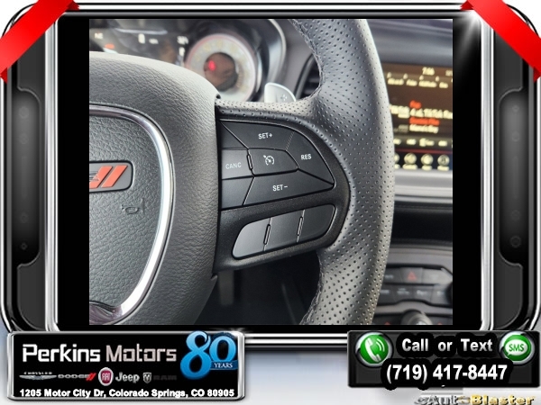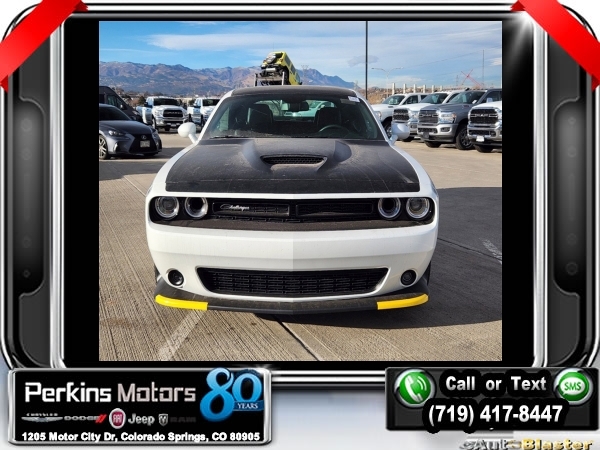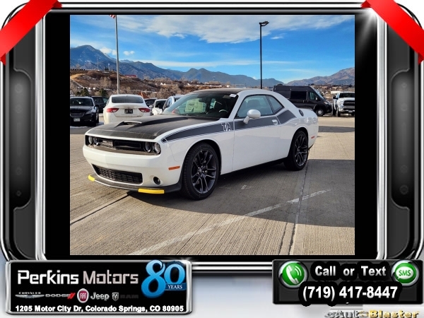 Factory MSRP: $56,175 $8,750 off MSRP! White Knuckle Clearcoat 2023 Dodge Challenger R/T RWD 8-Speed Automatic HEMI 5.7L V8 Multi Displacement VVT<br><br>Check us out at www.perkinsmotors.com to see our specials! Since opening our doors in 1944, we’ve been proud to serve Colorado Springs, CO, and the surrounding areas of Pueblo, Castle Rock and Denver, CO. Throughout this time of being family owned for 80 years, we’ve maintained a firm commitment to our customers: to offer a wide selection of New Chrysler, Dodge, Fiat, Jeep, and Ram vehicles and quality pre-owned vehicles, and provide a quick, no-hassle car-buying process that ensures everyone drives off the lot satisfied with their purchase.<br><br>Plus Package (1-Yr SiriusXM Guardian Trial, 276 Watt Amplifier, 4G LTE Wi-Fi Hot Spot, Apple CarPlay, Black-Edged Premium Floormats, Body Color Exterior Mirrors, Compass Gauge, Deluxe Security Alarm, Dodge Performance Pages, Door Trim Panel w/Ambient Lighting, Exterior Mirrors w/Heating Element, For Details, Visit DriveUconnect.com, For More Info, Call 800-643-2112, Front Fog Lamps, Google Android Auto, GPS Antenna Input, HD Radio, Heated Steering Wheel, Integrated Center Stack Radio, Integrated Voice Command w/Bluetooth, Line Lock, Media Hub (2 USB, AUX), Power Multi-Function Foldaway Mirrors, Premium-Stitched Dash Panel, Radio: Uconnect 4C w/8.4 Display, Rhombi Illum Air Catcher Headlamp, SiriusXM Radio Service, SiriusXM Satellite Radio, and USB Host Flip), Quick Order Package 28H, T/A Package (Black Fuel Filler Door, Black Grille w/Bezel, Black Satin Painted Hood, Challenger Script Grille Badge, Gloss Black I/P Cluster Trim Rings, Illuminated Air-Catcher Headlamps, MOPAR Cold Air Intake System, Rhombi 2-Pc Wheel Center Cap, Satin Wrap Roof/Decklid, T/A Bodyside Graphic, T/A Spoiler Decal, Wheels: 20 x 9.0 Lo Gloss Granite Crystal, and White Face Instrument Cluster), 4-Wheel Disc Brakes, 6 Speakers, ABS brakes, Air Conditioning, Alloy wheels, AM/FM radio, Anti-whiplash front head restraints, Apple CarPlay/Android Auto, Auto-dimming Rear-View mirror, Automatic temperature control, Brake assist, Bumpers: body-color, Cruise Control, Delay-off headlights, Driver door bin, Driver vanity mirror, Dual front impact airbags, Dual front side impact airbags, Electronic Stability Control, Four wheel independent suspension, Front anti-roll bar, Front Bucket Seats, Front Center Armrest, Front dual zone A/C, Front License Plate Bracket, Front reading lights, Fully automatic headlights, Garage door transmitter, Heated door mirrors, Houndstooth Cloth Performance Seats, Illuminated entry, Leather Shift Knob, Low tire pressure warning, Outside temperature display, Overhead airbag, Overhead console, Panic alarm, ParkView Rear Back-Up Camera, Passenger door bin, Passenger vanity mirror, Power door mirrors, Power driver seat, Power steering, Power Sunroof, Power windows, Radio data system, Radio: Uconnect 4 w/7 Display, Rear anti-roll bar, Rear reading lights, Rear seat center armrest, Rear window defroster, Remote keyless entry, Security system, Speed-sensing steering, Split folding rear seat, Spoiler, Sport steering wheel, Steering wheel mounted audio controls, Tachometer, Telescoping steering wheel, Tilt steering wheel, Traction control, Trip computer, Variably intermittent wipers, and Wheels: 20 x 8.0 Machined w/Granite PockeT. Sale price includes all manufacture's incentives and dealer discounts. Sale price not available on lease or compatible with special APR. $1000 - 2023 DODGE Denver BC Bonus Cash DECPA. Exp. 06/03/2024 $3750 - 2023 DODGE National Power Dollars Retail Bonus Cash 38CP9. Exp. 06/03/2024