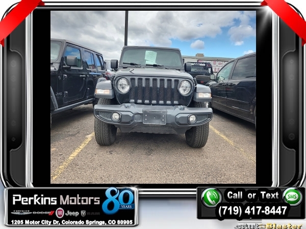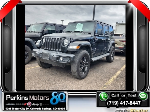 Black Clearcoat 4WD 2.0L I4 DOHC 8-Speed Automatic<br><br>240 Amp Alternator, 7 & 4 Pin Wiring Harness, 700 Amp Maintenance Free Battery, Auxiliary Switches, Black Interior Accents, Black Trail Rated Badge, Body Color 3-Piece Hard Top, Body Color Grille w/Gloss Black Rings, Class II Receiver Hitch, Cold Weather Group, Heated Front Seats, Heated Steering Wheel, Leather Trimmed Bucket Seats, Leather Wrapped Park Brake Handle, Leather Wrapped Shift Knob, Matte Black Jeep Badge, Mold In Color Bumper w/Gloss Black, MOPAR Hardtop Headliner, Quick Order Package 22L Altitude, Trailer Tow & HD Electrical Group, Wheels: 18 x 7.5 Gloss Black Aluminum, Wizard Black Instrument Panel Bezels.<br><br><br>CARFAX One-Owner. Clean CARFAX.<br><br>Check us out at www.perkinsmotors.com to see our specials! Since opening our doors in 1944, we’ve been proud to serve Colorado Springs, CO, and the surrounding areas of Pueblo, Castle Rock and Denver, CO. Throughout this time of being family owned for 80 years, we’ve maintained a firm commitment to our customers: to offer a wide selection of New Chrysler, Dodge, Fiat, Jeep, and Ram vehicles and quality pre-owned vehicles, and provide a quick, no-hassle car-buying process that ensures everyone drives off the lot satisfied with their purchase.<br><br><br>Cold Weather Group (Heated Front Seats and Heated Steering Wheel), Quick Order Package 22L Altitude (Black Interior Accents, Black Trail Rated Badge, Body Color 3-Piece Hard Top, Body Color Grille w/Gloss Black Rings, Leather Trimmed Bucket Seats, Leather Wrapped Park Brake Handle, Leather Wrapped Shift Knob, Matte Black Jeep Badge, Mold In Color Bumper w/Gloss Black, MOPAR Hardtop Headliner, Wheels: 18 x 7.5 Gloss Black Aluminum, and Wizard Black Instrument Panel Bezels), Trailer Tow & HD Electrical Group (240 Amp Alternator, 7 & 4 Pin Wiring Harness, 700 Amp Maintenance Free Battery, Auxiliary Switches, and Class II Receiver Hitch), 3.45 Rear Axle Ratio, 4-Wheel Disc Brakes, 8 Speakers, ABS brakes, Air Conditioning, Alloy wheels, AM/FM radio: SiriusXM, Apple CarPlay, Apple CarPlay/Android Auto, Automatic temperature control, Aux Battery, Brake assist, Cloth Low-Back Bucket Seats, Compass, Cruise Control, Delay-off headlights, Driver door bin, Driver vanity mirror, Dual front impact airbags, Dual front side impact airbags, Electronic Stability Control, Front anti-roll bar, Front Bucket Seats, Front Center Armrest w/Storage, Front dual zone A/C, Front fog lights, Front License Plate Bracket, Front reading lights, Fully automatic headlights, Garage door transmitter, Glass Window Material, Google Android Auto, GPS Antenna Input, Heated door mirrors, Heavy Duty Suspension w/Gas Shocks, Illuminated entry, Integrated roll-over protection, Integrated Voice Command w/Bluetooth, Jeep Trail Rated Kit, Leather steering wheel, Low tire pressure warning, Manufacturer's Statement of Origin, Non-Lock Fuel Cap w/o Discriminator, Occupant sensing airbag, Outside temperature display, Panic alarm, ParkView Rear Back-Up Camera, Passenger door bin, Passenger vanity mirror, Power door mirrors, Power steering, Power windows, Radio data system, Radio: Uconnect 4 w/7 Display, Rear anti-roll bar, Rear reading lights, Remote keyless entry, Remote Proximity Keyless Entry, Remote Start System, Security system, Split folding rear seat, Steering wheel mounted audio controls, Stop-Start Dual Battery System, Tachometer, Telescoping steering wheel, Tilt steering wheel, Traction control, Trip computer, Variably intermittent wipers, Voltmeter, and Wheels: 18 x 7.5 Polished w/Gray Spokes.