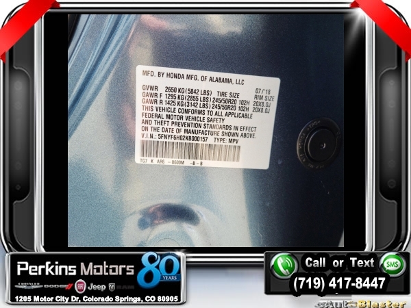 Sapphire AWD 3.5L V6 24V SOHC i-VTEC 9-Speed Automatic<br><br>AWD.<br><br><br>Check us out at www.perkinsmotors.com to see our specials! Since opening our doors in 1944, we’ve been proud to serve Colorado Springs, CO, and the surrounding areas of Pueblo, Castle Rock and Denver, CO. Throughout this time of being family owned for 80 years, we’ve maintained a firm commitment to our customers: to offer a wide selection of New Chrysler, Dodge, Fiat, Jeep, and Ram vehicles and quality pre-owned vehicles, and provide a quick, no-hassle car-buying process that ensures everyone drives off the lot satisfied with their purchase.<br><br><br>Awards:<br> * ALG Residual Value Awards, Residual Value Awards<br><br>AWD, 10 Speakers, 3rd row seats: split-bench, 4-Wheel Disc Brakes, 4.334 Axle Ratio, A/V remote: CabinControl, ABS brakes, Air Conditioning, Alloy wheels, AM/FM radio: SiriusXM, Apple CarPlay/Android Auto, Auto High-beam Headlights, Auto-dimming door mirrors, Auto-dimming Rear-View mirror, Automatic temperature control, Blind Spot Information (BSI) System warning, Brake assist, Bumpers: body-color, Compass, Cruise Control, Delay-off headlights, Driver door bin, Driver vanity mirror, Dual front impact airbags, Dual front side impact airbags, Electronic Stability Control, Emergency communication system: HondaLink, Exterior Parking Camera Rear, Forward collision: Collision Mitigation Braking System (CMBS) + FCW mitigation, Four wheel independent suspension, Front anti-roll bar, Front Bucket Seats, Front Center Armrest, Front dual zone A/C, Front fog lights, Front reading lights, Fully automatic headlights, Garage door transmitter: HomeLink, Headphones, Heated & Ventilated Front Bucket Seats, Heated door mirrors, Heated front seats, Heated rear seats, Heated steering wheel, Illuminated entry, Lane departure: Lane Keeping Assist System (LKAS) active, Low tire pressure warning, Memory seat, Navigation system: Honda Satellite-Linked Navigation System, Occupant sensing airbag, Outside temperature display, Overhead airbag, Overhead console, Panic alarm, Passenger door bin, Passenger vanity mirror, Perforated Leather-Trimmed Seats, Power door mirrors, Power driver seat, Power Liftgate, Power moonroof, Power passenger seat, Power steering, Power windows, Radio data system, Radio: AM/FM Premium Audio System, Rain sensing wipers, Rear air conditioning, Rear anti-roll bar, Rear reading lights, Rear window defroster, Rear window wiper, Remote keyless entry, Roof rack: rails only, Security system, Speed-sensing steering, Speed-Sensitive Wipers, Split folding rear seat, Spoiler, Steering wheel mounted audio controls, Tachometer, Telescoping steering wheel, Tilt steering wheel, Traction control, Trip computer, Turn signal indicator mirrors, Variably intermittent wipers, Ventilated front seats, and Wheels: 20 Machine-Finished Alloy.