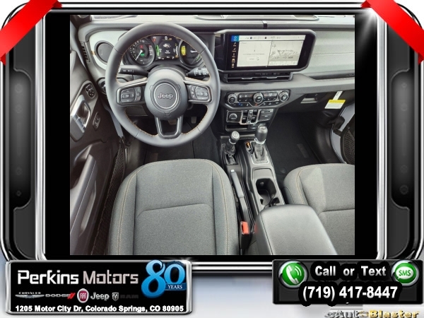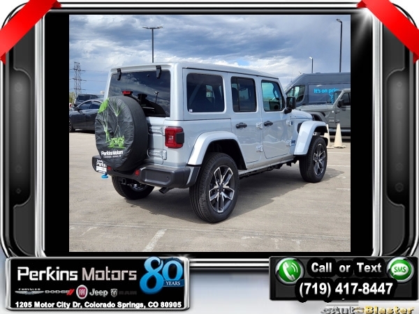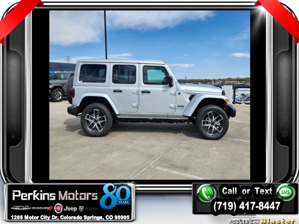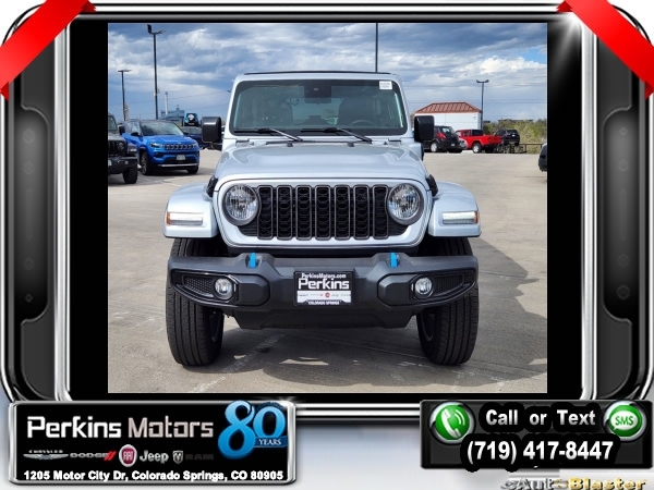 Factory MSRP: $63,060 $9,895 off MSRP! Silver Zynith Clearcoat 2024 Jeep Wrangler Sport S 4xe 4WD 8-Speed Automatic 2.0L I4 DOHC<br>2.0L I4 DOHC.<br>Check us out at www.perkinsmotors.com to see our specials! Since opening our doors in 1944, we’ve been proud to serve Colorado Springs, CO, and the surrounding areas of Pueblo, Castle Rock and Denver, CO. Throughout this time of being family owned for 80 years, we’ve maintained a firm commitment to our customers: to offer a wide selection of New Chrysler, Dodge, Fiat, Jeep, and Ram vehicles and quality pre-owned vehicles, and provide a quick, no-hassle car-buying process that ensures everyone drives off the lot satisfied with their purchase.<br><br>Convenience Group (2-Door Passive Entry, Front Door Locks and Universal Garage Door Opener), Quick Order Package 29U Sport S, Safety Group (Auto High Beam Headlamp Control and LED Taillamps), Technology Group (Alpine Premium Audio System and EV/PHEV Vehicle To Load), Trailer Tow & Aux Switch Group, 2.0L I4 DOHC, 3.73 Rear Axle Ratio, 4-Wheel Disc Brakes, 8 Speakers, ABS brakes, Air Conditioning, Alloy wheels, Apple CarPlay/Android Auto, Automatic temperature control, Brake assist, Cloth Low-Back Bucket Seats, Compass, Cruise Control, Delay-off headlights, Driver door bin, Driver vanity mirror, Dual front impact airbags, Dual front side impact airbags, Electronic Stability Control, Front anti-roll bar, Front Bucket Seats, Front Center Armrest w/Storage, Front dual zone A/C, Front fog lights, Front License Plate Bracket, Front reading lights, Fully automatic headlights, Heated door mirrors, Illuminated entry, Integrated roll-over protection, Low tire pressure warning, Occupant sensing airbag, Outside temperature display, Overhead airbag, Panic alarm, ParkView Rear Back-Up Camera, Passenger door bin, Passenger vanity mirror, Power door mirrors, Power steering, Power windows, Radio data system, Radio: Uconnect 5 w/12.3 Display, Rear anti-roll bar, Rear reading lights, Remote keyless entry, Removable Rear Quarter Windows, Security system, Sky 1-Touch Power Top, Split folding rear seat, Sport Suspension, Steering wheel mounted audio controls, Tachometer, Telescoping steering wheel, Tilt steering wheel, Traction control, Trip computer, Variably intermittent wipers, Voltmeter, and Wheels: 20 x 8 Machined/Painted Gray. Sale price includes all manufacture's incentives and dealer discounts. Sale price not available on lease or compatible with special APR. $3000 - 2024 National Retail Consumer Cash . Exp. 07/01/2024 $3750 - Federal EV Tax Credit. Exp. 12/31/2024