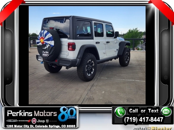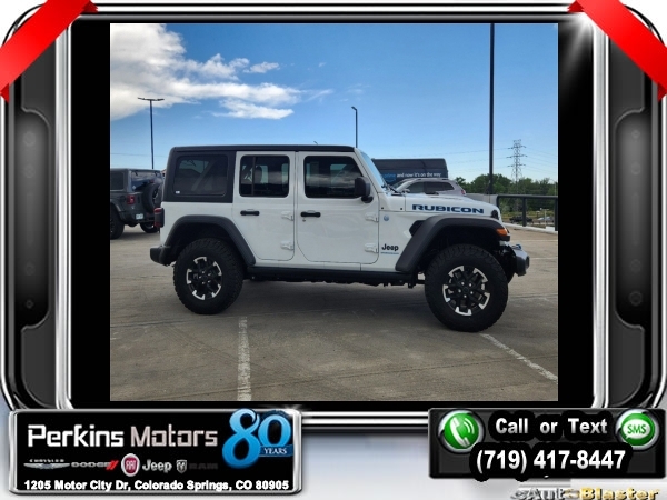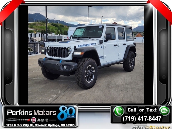 Factory MSRP: $68,630 $19,750 off MSRP! Priced below KBB Fair Purchase Price! Bright White Clearcoat 2024 Jeep Wrangler Rubicon 4xe 4WD 8-Speed Automatic 2.0L I4 DOHC<br>2.0L I4 DOHC.<br>Check us out at www.perkinsmotors.com to see our specials! Since opening our doors in 1944, we’ve been proud to serve Colorado Springs, CO, and the surrounding areas of Pueblo, Castle Rock and Denver, CO. Throughout this time of being family owned for 80 years, we’ve maintained a firm commitment to our customers: to offer a wide selection of New Chrysler, Dodge, Fiat, Jeep, and Ram vehicles and quality pre-owned vehicles, and provide a quick, no-hassle car-buying process that ensures everyone drives off the lot satisfied with their purchase.<br><br>Convenience Group (Heated Front Seats, Remote Start System, and Universal Garage Door Opener), Quick Order Package 29V Rubicon, Safety Group, Technology Group (12.3 Touchscreen Display, 4G LTE Wi-Fi Hot Spot, Apple CarPlay, Connectivity - US/Canada, Disassociated Touchscreen Display, Google Android Auto, GPS Navigation, HD Radio, Integrated Center Stack Radio, Integrated Voice Command w/Bluetooth, Radio: Uconnect 5 Nav w/12.3 Display, and SiriusXM w/360L), 2.0L I4 DOHC, 4-Wheel Disc Brakes, 4.10 Rear Axle Ratio, 8 Speakers, ABS brakes, Air Conditioning, Alloy wheels, AM/FM radio: SiriusXM, Apple CarPlay/Android Auto, Automatic temperature control, Black 3-Piece Hard Top, Brake assist, Compass, Cruise Control, Delay-off headlights, Driver door bin, Driver vanity mirror, Dual front impact airbags, Dual front side impact airbags, Electronic Stability Control, Emergency communication system: Jeep Connect, Freedom Panel Storage Bag, Front anti-roll bar, Front Bucket Seats, Front Center Armrest w/Storage, Front dual zone A/C, Front fog lights, Front reading lights, Fully automatic headlights, Heated door mirrors, Illuminated entry, Integrated roll-over protection, Low tire pressure warning, MOPAR All-Weather Floor Mats, Occupant sensing airbag, Outside temperature display, Overhead airbag, Panic alarm, ParkView Rear Back-Up Camera, Passenger door bin, Passenger vanity mirror, Performance Suspension, Power door mirrors, Power steering, Power windows, Radio data system, Radio: Uconnect 5 w/12.3 Display, Rear anti-roll bar, Rear reading lights, Remote keyless entry, Security system, Split folding rear seat, Steering wheel mounted audio controls, Sustainable Premium Cloth Seats, Tachometer, Telescoping steering wheel, Tilt steering wheel, Traction control, Trip computer, Variably intermittent wipers, Voltmeter, and Wheels: 17 x 7.5 Machined w/Black Pockets. Sale price includes all manufacture's incentives and dealer discounts. Sale price not available on lease or compatible with special APR. $3750 - Federal EV Tax Credit. Exp. 12/31/2024