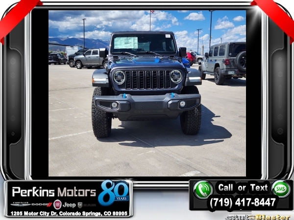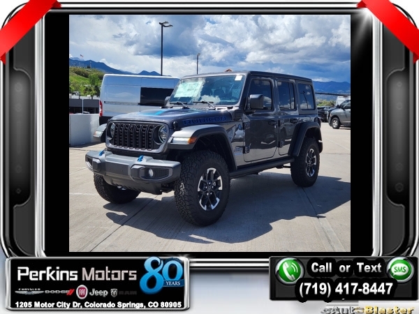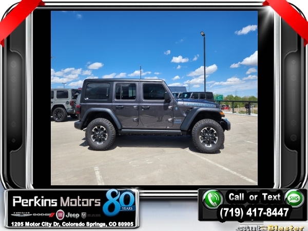 Factory MSRP: $69,225 $10,124 off MSRP! Priced below KBB Fair Purchase Price! Granite Crystal Metallic Clearcoat 2024 Jeep Wrangler Rubicon 4xe 4WD 8-Speed Automatic 2.0L I4 DOHC<br>2.0L I4 DOHC.<br>Check us out at www.perkinsmotors.com to see our specials! Since opening our doors in 1944, we’ve been proud to serve Colorado Springs, CO, and the surrounding areas of Pueblo, Castle Rock and Denver, CO. Throughout this time of being family owned for 80 years, we’ve maintained a firm commitment to our customers: to offer a wide selection of New Chrysler, Dodge, Fiat, Jeep, and Ram vehicles and quality pre-owned vehicles, and provide a quick, no-hassle car-buying process that ensures everyone drives off the lot satisfied with their purchase.<br><br>Convenience Group (Heated Front Seats and Universal Garage Door Opener), Quick Order Package 29V Rubicon, Safety Group, Technology Group (12.3 Touchscreen Display, 4G LTE Wi-Fi Hot Spot, Apple CarPlay, Connectivity - US/Canada, Disassociated Touchscreen Display, Google Android Auto, GPS Navigation, HD Radio, Integrated Center Stack Radio, Integrated Off-Road Camera, Integrated Voice Command w/Bluetooth, Radio: Uconnect 5 Nav w/12.3 Display, SiriusXM Radio Service, and SiriusXM w/360L), 2.0L I4 DOHC, 4-Wheel Disc Brakes, 4.10 Rear Axle Ratio, 8 Speakers, ABS brakes, Air Conditioning, Alloy wheels, AM/FM radio: SiriusXM, Apple CarPlay/Android Auto, Automatic temperature control, Black 3-Piece Hard Top, Brake assist, Compass, Cruise Control, Delay-off headlights, Driver door bin, Driver vanity mirror, Dual front impact airbags, Dual front side impact airbags, Electronic Stability Control, Freedom Panel Storage Bag, Front anti-roll bar, Front Bucket Seats, Front Center Armrest w/Storage, Front dual zone A/C, Front fog lights, Front reading lights, Fully automatic headlights, Garage door transmitter, Heated door mirrors, Illuminated entry, Integrated roll-over protection, Low tire pressure warning, MOPAR All-Weather Floor Mats, No Soft Top, Occupant sensing airbag, Outside temperature display, Overhead airbag, Panic alarm, ParkView Rear Back-Up Camera, Passenger door bin, Passenger vanity mirror, Performance Suspension, Power door mirrors, Power steering, Power windows, Radio data system, Radio: Uconnect 5 w/12.3 Display, Rear anti-roll bar, Rear reading lights, Remote keyless entry, Security system, Split folding rear seat, Steering wheel mounted audio controls, Sustainable Premium Cloth Seats, Tachometer, Telescoping steering wheel, Tilt steering wheel, Traction control, Trip computer, Variably intermittent wipers, Voltmeter, and Wheels: 17 x 7.5 Machined w/Black Pockets. Sale price includes all manufacture's incentives and dealer discounts. Sale price not available on lease or compatible with special APR. $3000 - 2024 DJR National Retail Consumer Cash 24CR1. Exp. 06/03/2024 $3750 - Federal EV Tax Credit. Exp. 12/31/2024