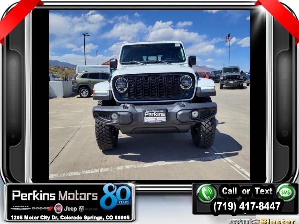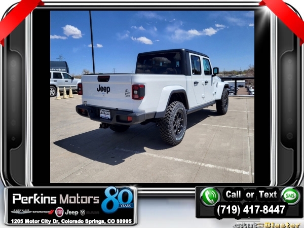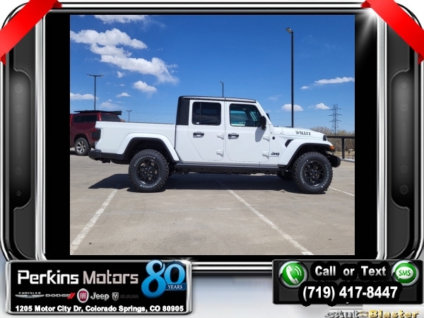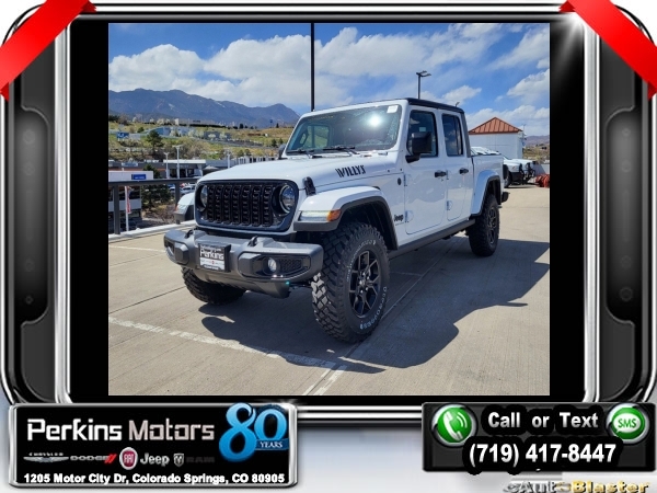 Factory MSRP: $53,080 $6,203 off MSRP! Bright White Clearcoat 2024 Jeep Gladiator Sport 4WD 8-Speed Automatic 3.6L V6 24V VVT<br><br>Check us out at www.perkinsmotors.com to see our specials! Since opening our doors in 1944, we’ve been proud to serve Colorado Springs, CO, and the surrounding areas of Pueblo, Castle Rock and Denver, CO. Throughout this time of being family owned for 80 years, we’ve maintained a firm commitment to our customers: to offer a wide selection of New Chrysler, Dodge, Fiat, Jeep, and Ram vehicles and quality pre-owned vehicles, and provide a quick, no-hassle car-buying process that ensures everyone drives off the lot satisfied with their purchase.<br><br>Convenience Group (Air Conditioning w/Auto Temperature Control, Cluster 7.0 TFT Color Display, Emergency/Assistance Call, Front Door Locks 2-Door Passive Entry, Heated Front Seats, Heated Steering Wheel, Remote Start System, and Universal Garage Door Opener), Quick Order Package 24W Willys (240 Amp Alternator, 4-Wheel Drive Decal, 97 MPH Vehicle Max Speed Calibration, Advanced Brake Assist, Automatic Headlamps, Auxiliary Switches, Black Grille, Body Color Fender Flares (2-Piece), Class IV Receiver Hitch, Corning Gorilla Glass, Daytime Running Lamps LED Accents, Deep Tint Sunscreen Windows, E-Locker Rear Axle, Enhanced Adaptive Cruise Control, Front 1-Touch Down Power Windows, Front Heavy Duty Red Accent Shock Absorbers, Front LED Fog Lamps, Full Speed Forward Collision Warning Plus, Heavy-Duty Engine Cooling, LED Premium Reflector Headlamps, LED Taillamps, Mold In Color Bumper w/Gloss Black, MOPAR All-Weather Slush Mats, Off-Road Plus Mode, Power Heated Mirrors, Power Tailgate Lock, Premium Wrapped Steering Wheel, Protection Sill Rails, Rear Heavy Duty Red Accent Shock Absorbers, Remote Keyless Entry, Security Alarm, Speed Sensitive Power Locks, Sun Visors w/Illuminated Vanity Mirrors, Trailer Hitch Zoom, Wheels: 17 x 7.5 Painted Black, Willy's Suspension, Willys, and Willys Hood Decal), 110 MPH Vehicle Max Speed Calibration, 12.3 Touchscreen Display, 3.73 Rear Axle Ratio, 4-Wheel Disc Brakes, 4G LTE Wi-Fi Hot Spot, 8 Speakers, ABS brakes, Air Conditioning, Alexa Built-In, AM/FM radio: SiriusXM with 360L, Apple CarPlay, Apple CarPlay/Android Auto, Black 3-Piece Hard Top, Brake assist, Cloth Low-Back Bucket Seats, Compass, Connectivity - US/Canada, Cruise Control, Delay-off headlights, Disassociated Touchscreen Display, Driver door bin, Driver vanity mirror, Dual front impact airbags, Dual front side impact airbags, Electronic Stability Control, Emergency communication system: Jeep Connect, For Details, Visit DriveUconnect.com, For More Info, Call 800-643-2112, Freedom Panel Storage Bag, Front anti-roll bar, Front Bucket Seats, Front Center Armrest w/Storage, Front fog lights, Front License Plate Bracket, Front reading lights, Google Android Auto, Integrated Center Stack Radio, Integrated roll-over protection, Low tire pressure warning, Manufacturer's Statement of Origin, Normal Duty Suspension, Occupant sensing airbag, Outside temperature display, Overhead airbag, ParkView Rear Back-Up Camera, Passenger door bin, Passenger vanity mirror, Power steering, Radio data system, Radio: Uconnect 5 w/12.3 Display, Rear anti-roll bar, Rear reading lights, Rear Sliding Window, Rear Window Defroster, SiriusXM Radio Service, SiriusXM w/360L, Split folding rear seat, Steering wheel mounted audio controls, Tachometer, Telescoping steering wheel, Tilt steering wheel, Traction control, Trip computer, Variably intermittent wipers, Voltmeter, and Wheels: 17 x 7.5 Black Steel StyleD. Sale price includes all manufacture's incentives and dealer discounts. Sale price not available on lease or compatible with special APR. $1000 - 2024 JR Denver BC Bonus Cash DECRA. Exp. 06/03/2024 $2000 - 2024 CJR Bonus Cash 24CRA. Exp. 06/03/2024